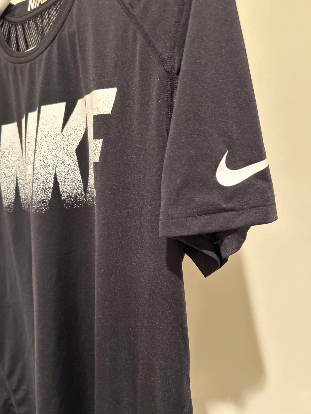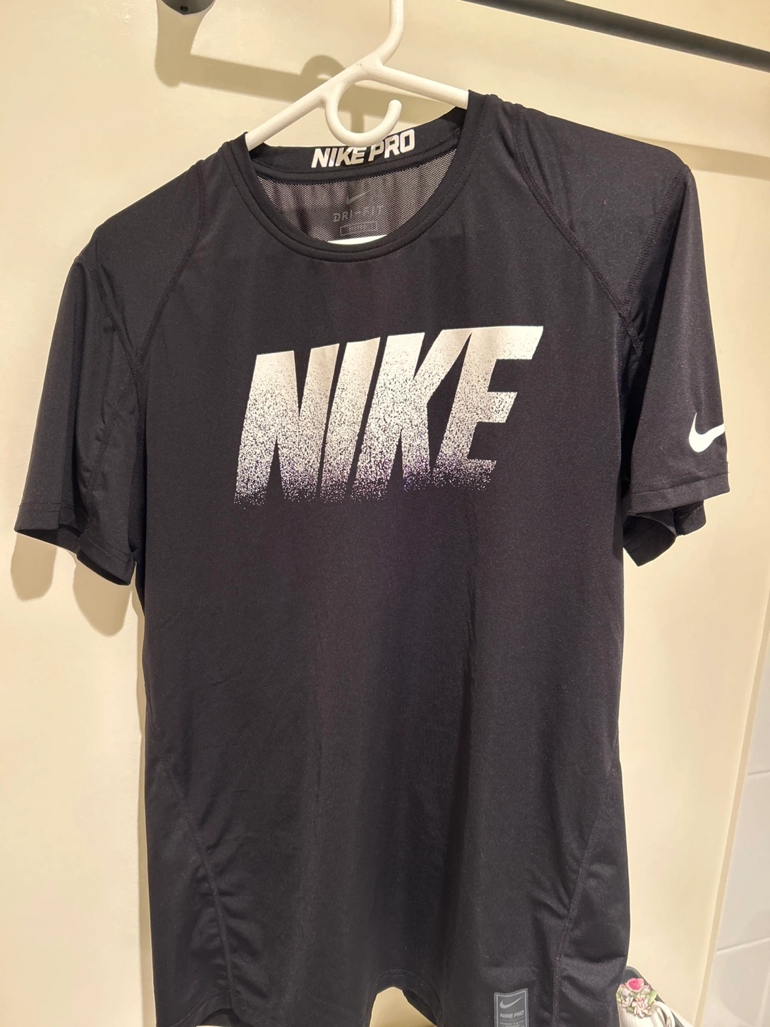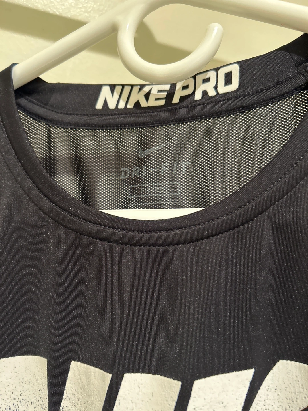 Black Nike Pro Dri-FIT t-shirt with a large white Nike logo graphic on the front. It's made with moisture-wicking fabric to keep you dry. This shirt is great for workouts and sports!