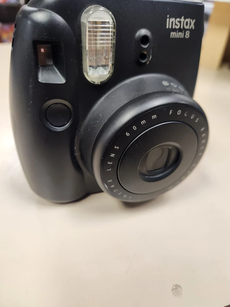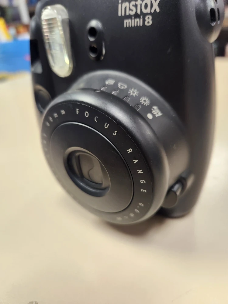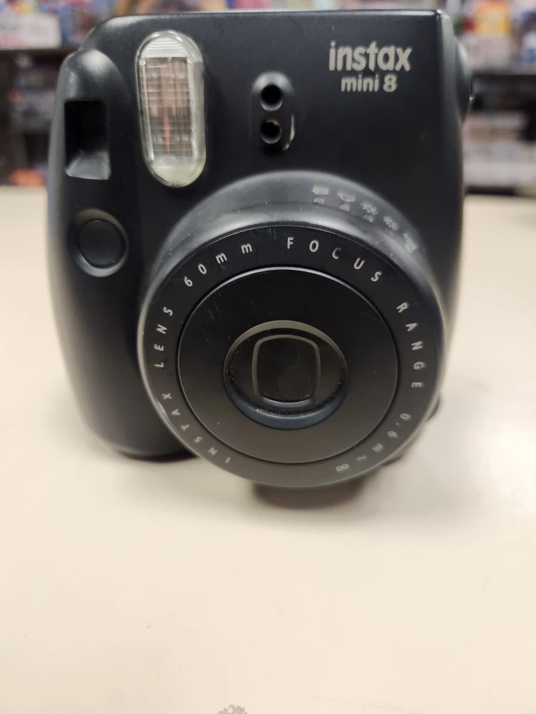 Selling a Fujifilm Instax Mini 8 camera in black. It's in good condition and ready to take some fun instant photos. Perfect for parties or capturing memories on the go! It has a lens with a 60mm focal length.