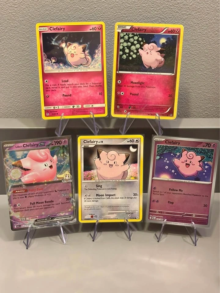 Bring five unique and happy Clefairy cards home with you!