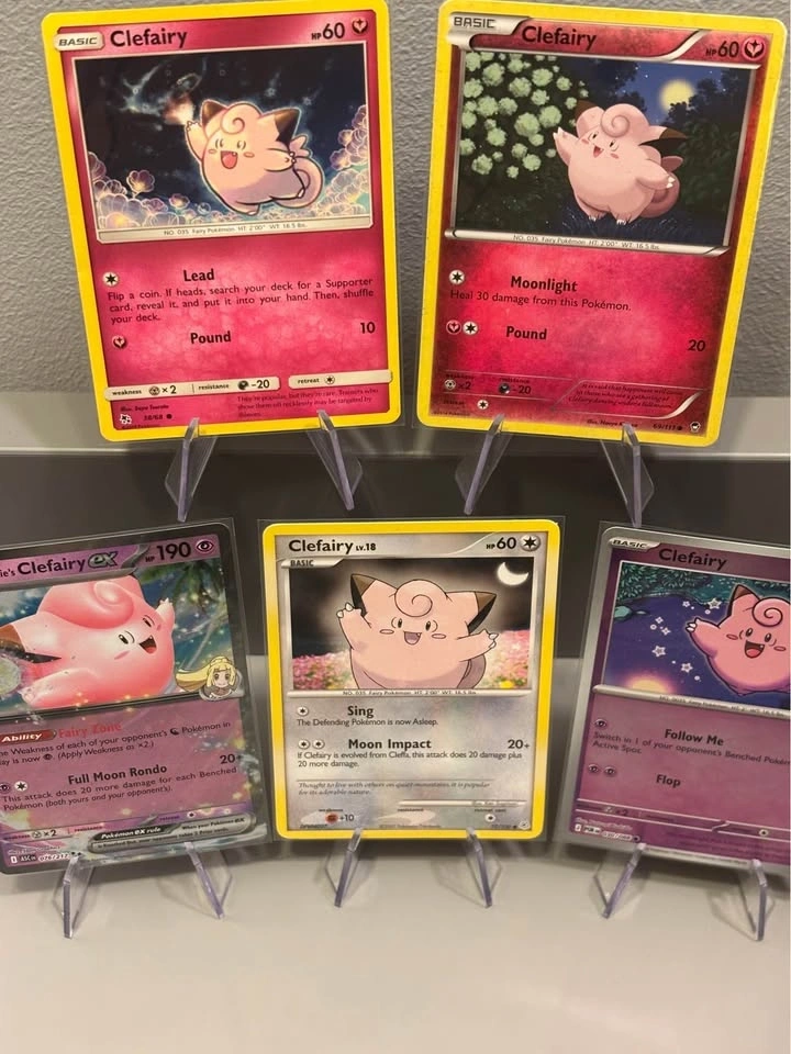 Bring five unique and happy Clefairy cards home with you!