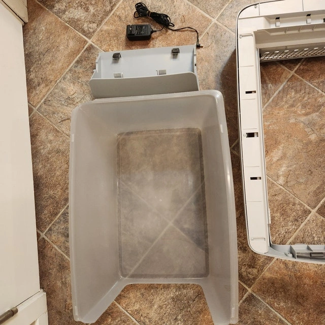 PetSafe Self Cleaning Cat Litter Box with Hood and Front Entry. Hands-free clean up. Power adapter included. Disposable litter tray NOT included. Used - Good Condition. Small chip at the base of the cover (see photos), but it doesn't affect function. Original price was over $307+GST. Selling for $120. Price is firm and non-negotiable. Cash only. Pick up in Allard, SW Edmonton. Curbside pickup available.