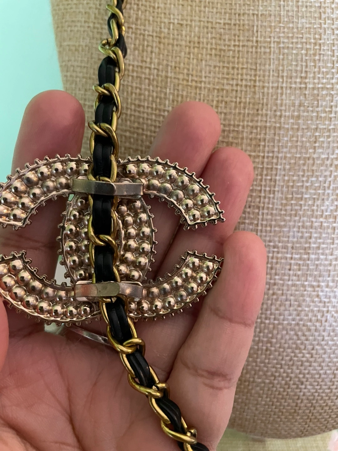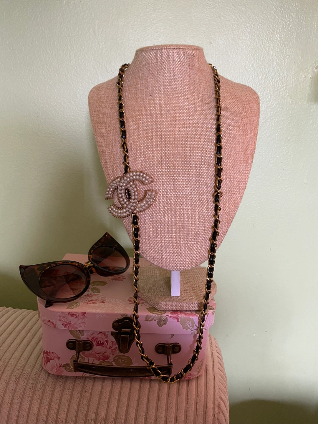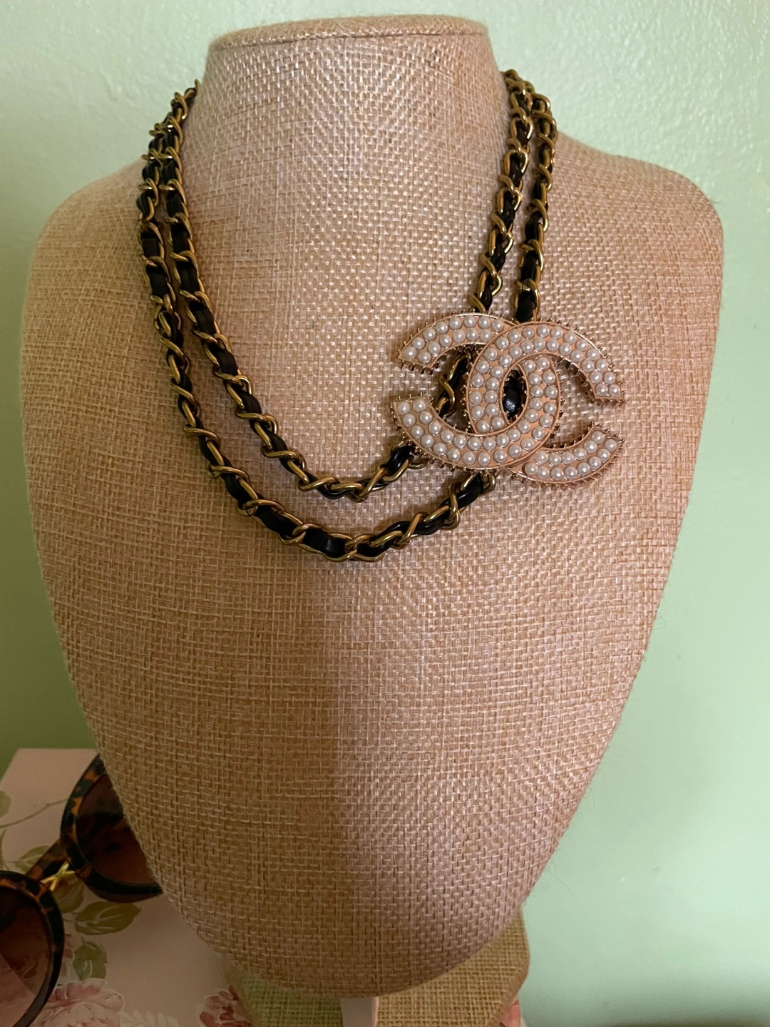 Elegant necklace features a pearl-embellished CC logo. Chanel logo repurposed from vintage Chanel shoe clip and chain from