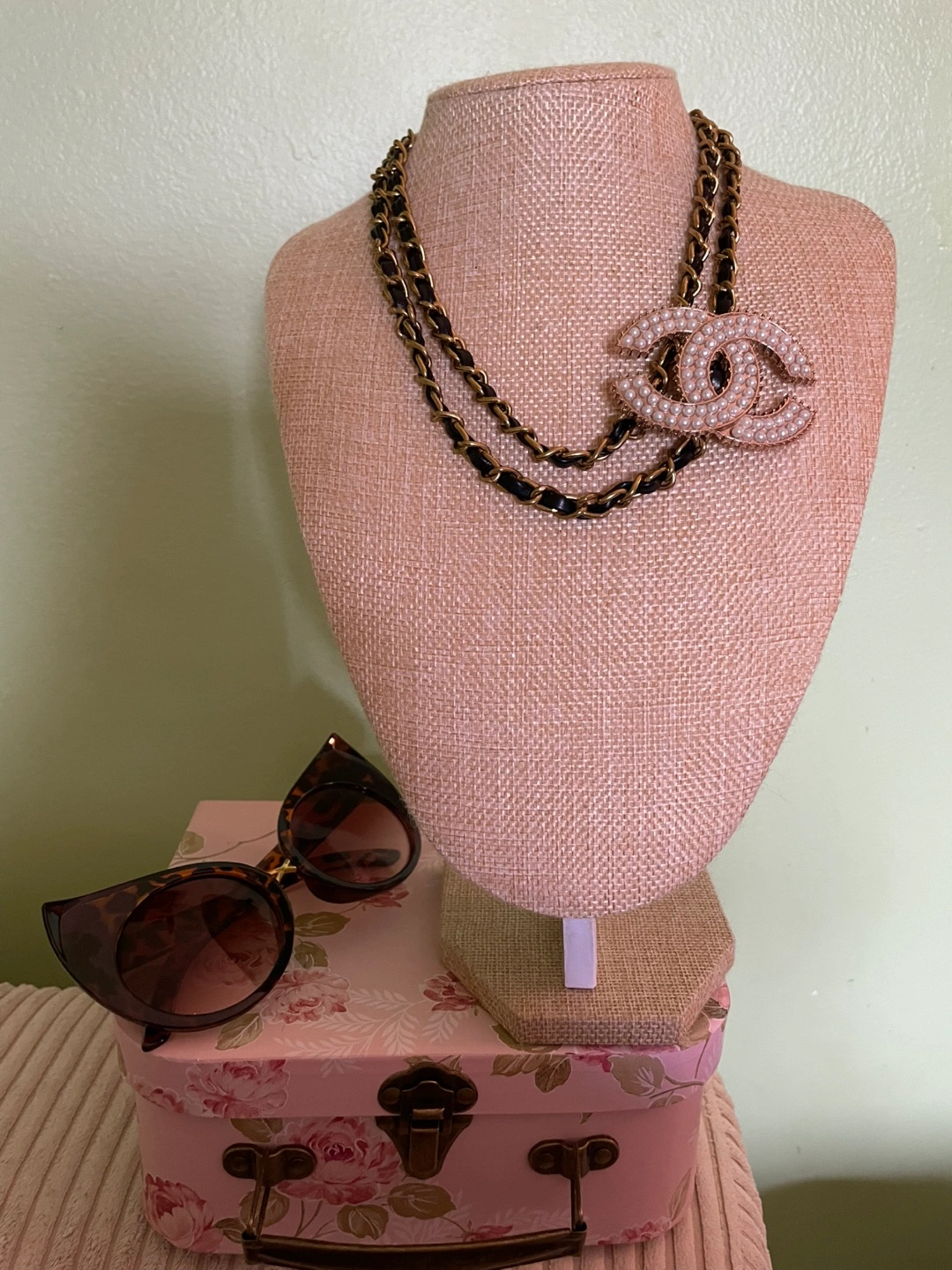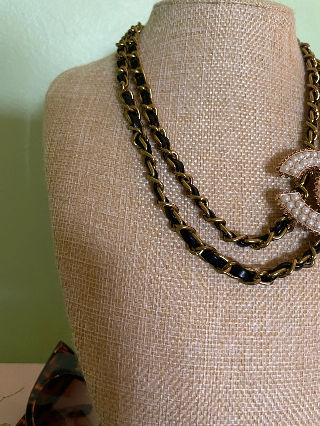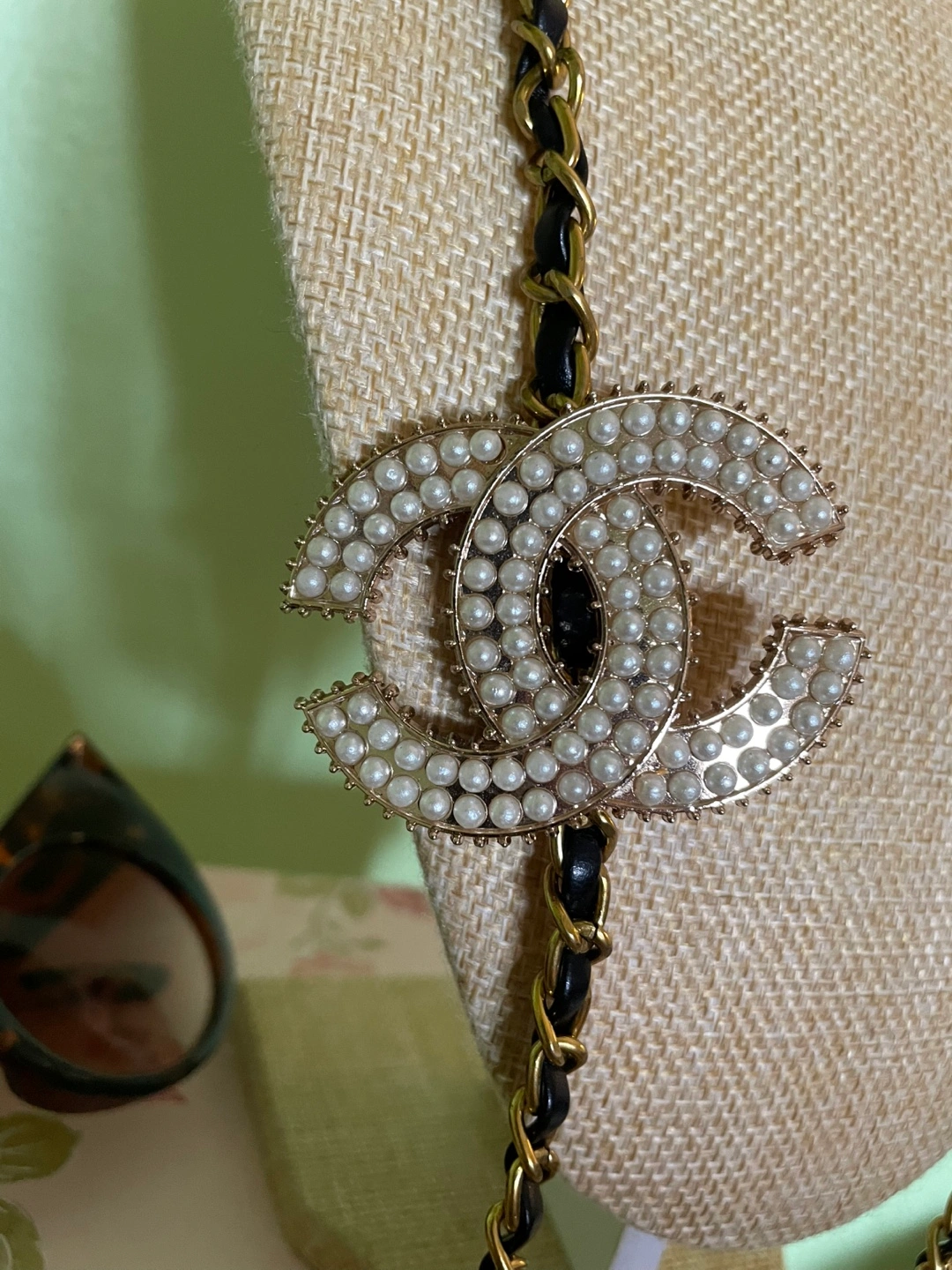 Elegant necklace features a pearl-embellished CC logo. Chanel logo repurposed from vintage Chanel shoe clip and chain from