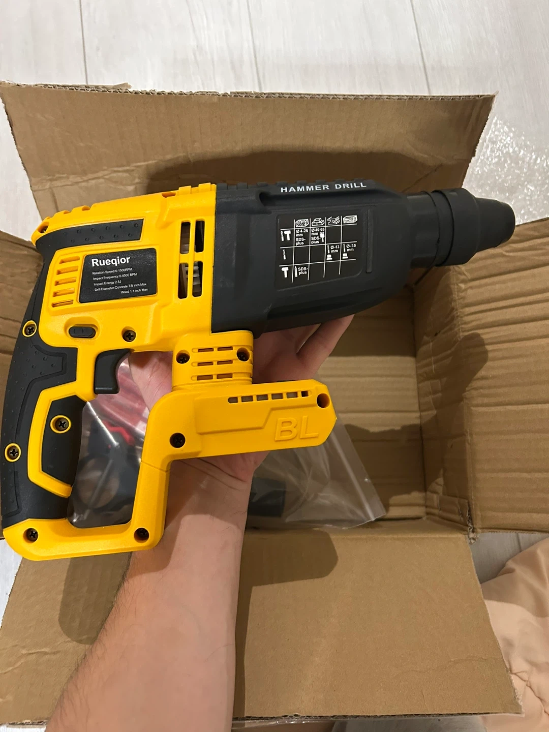 This Rueqor cordless hammer drill features a brushless motor for efficient power. It comes with drill bits in sizes 10 mm and 12 mm. This tool is ready for your construction or DIY projects!