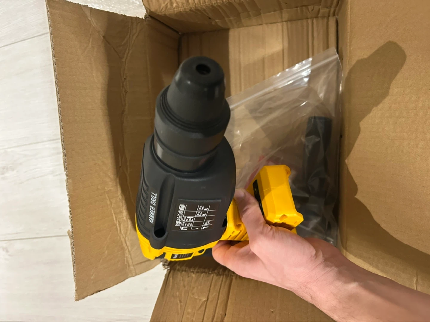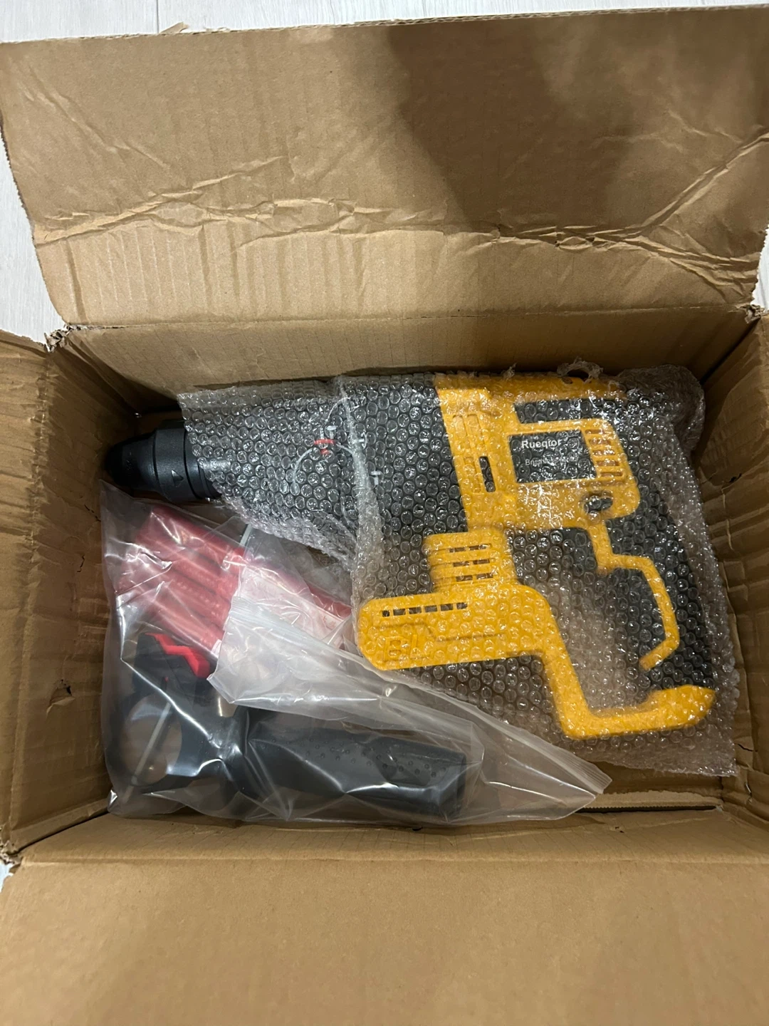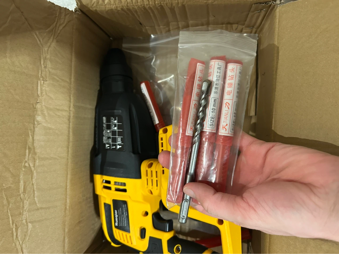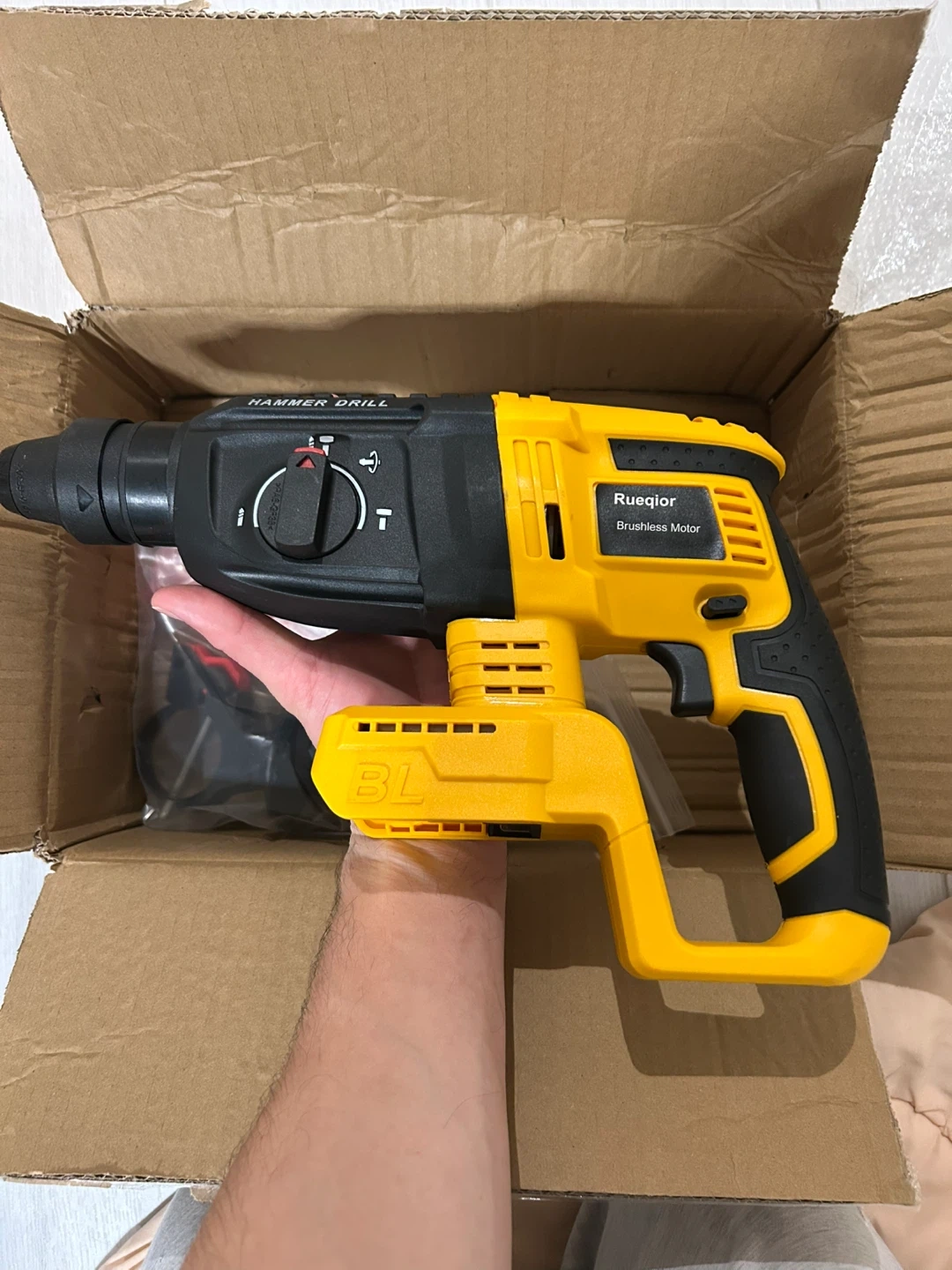 This Rueqor cordless hammer drill features a brushless motor for efficient power. It comes with drill bits in sizes 10 mm and 12 mm. This tool is ready for your construction or DIY projects!