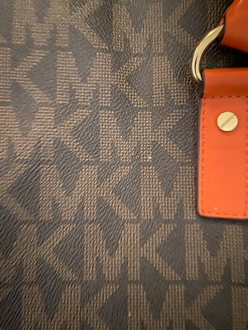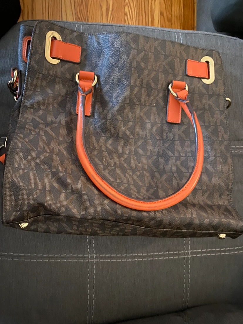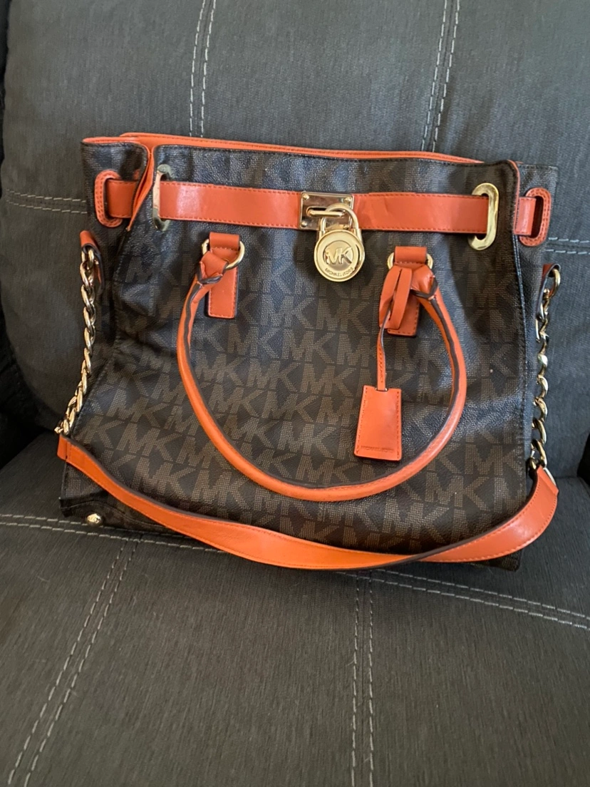 Brown and Orange Michael Kors handbag with a gold chain strap and gold accents.