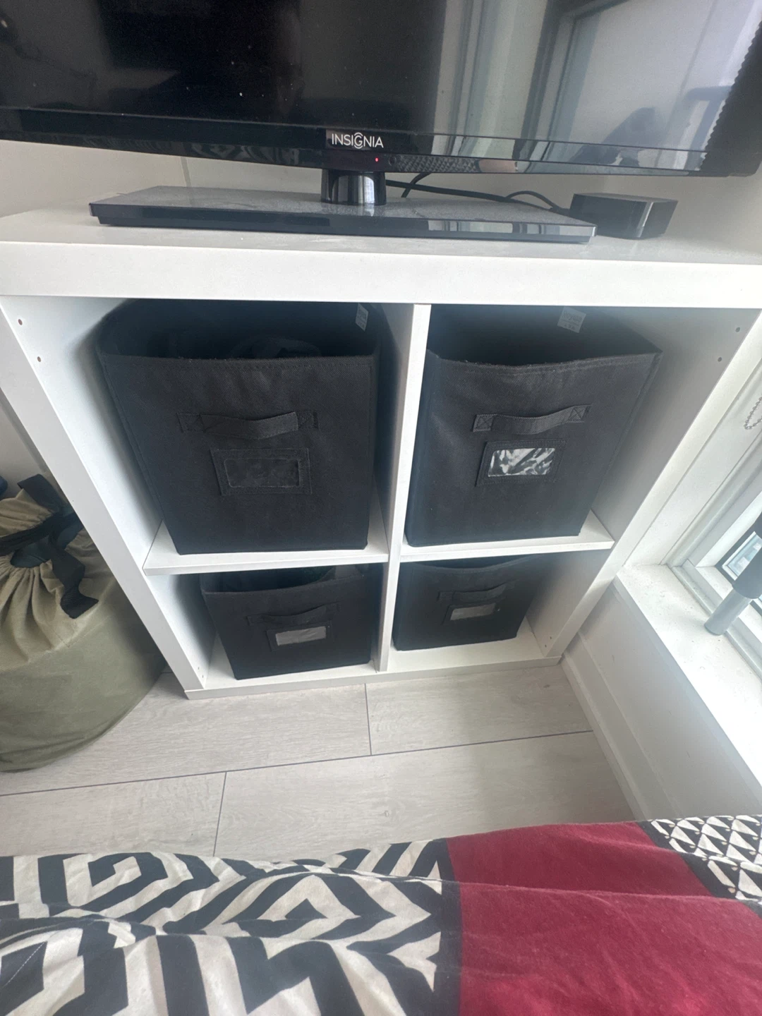 This white cube storage unit comes with four black fabric bins.