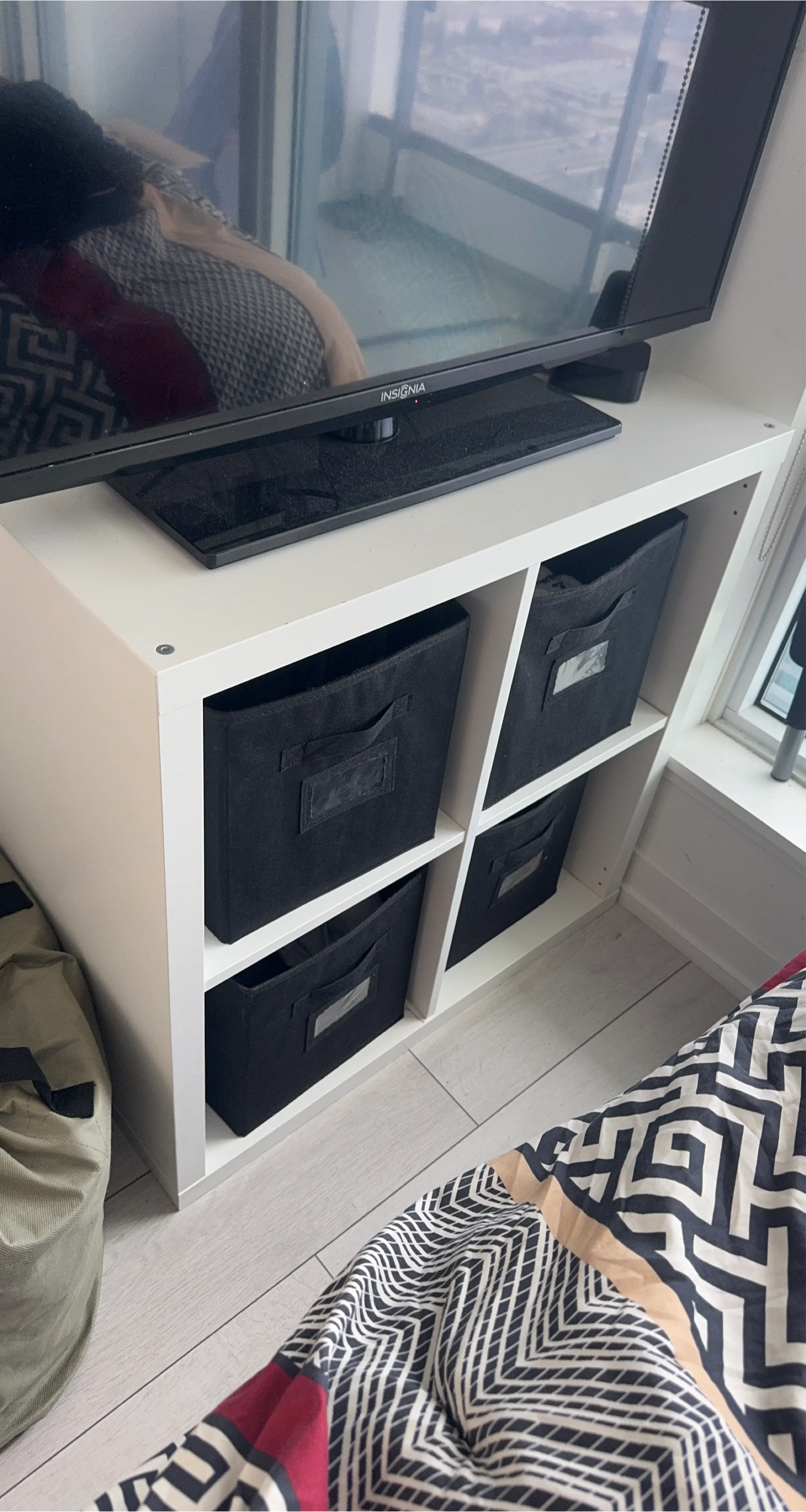 IKEA White Cube Storage Shelf with 4 Black Bins