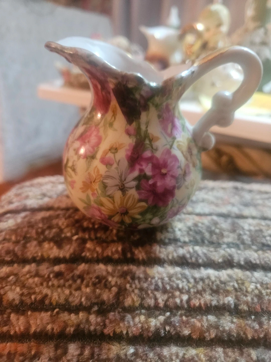 This is a vintage Royal Chintz creamer pitcher with a floral pattern. It's made of porcelain and features a gold ,and collectible figurine.