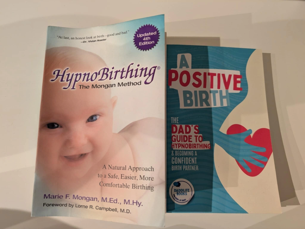 Two books about hypnobirthing. One is the Mongan Method, 4th edition. The other is a dad's guide to hypnobirthing and being a confident birth partner.