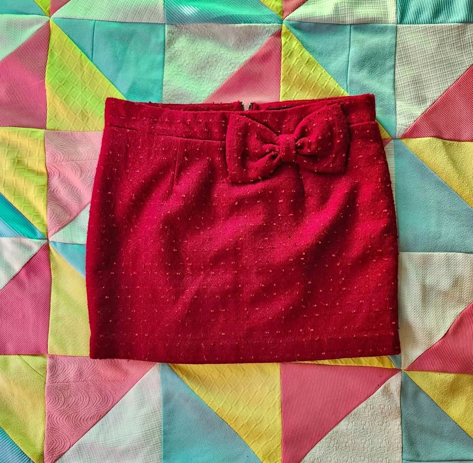Berry coloured mini skirt with bow and zipper detail. Super cute classic Forever 21 bow skirt!! vintage from 2002 (according to some other posts I saw). The skirt is a berry red/pink, the pictures are slightly off. The quality on this is so good and the skirt is lined inside, much better than modern Forever 21