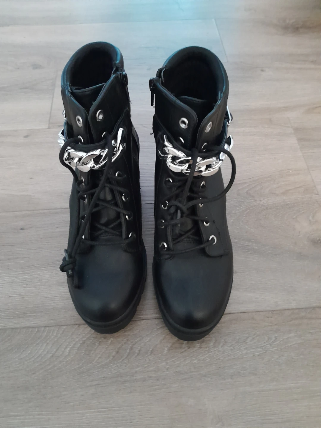 These black ankle boots feature a stylish chain detail. They're in great shape and ready for a new owner. Perfect for adding a bit of edge to any outfit!
