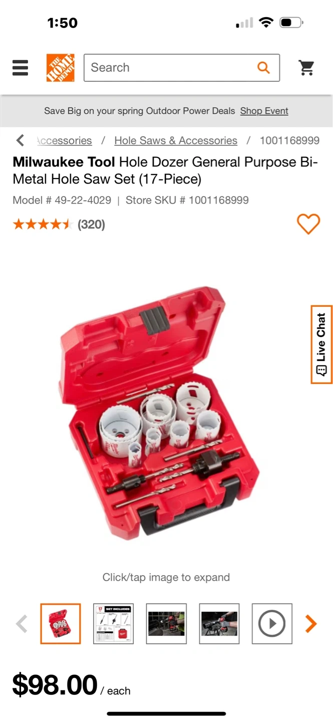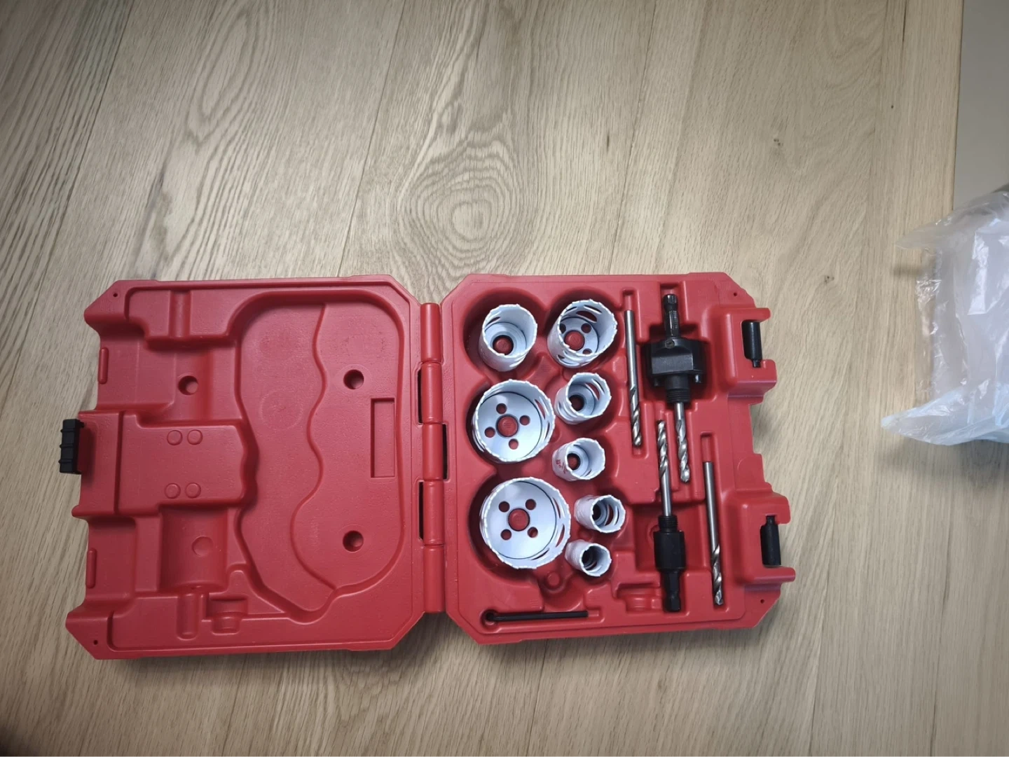 This is a 17-piece Milwaukee Tool bi-metal hole saw set. It comes with a durable red carrying case. Includes various sizes of hole saws and pilot bits.