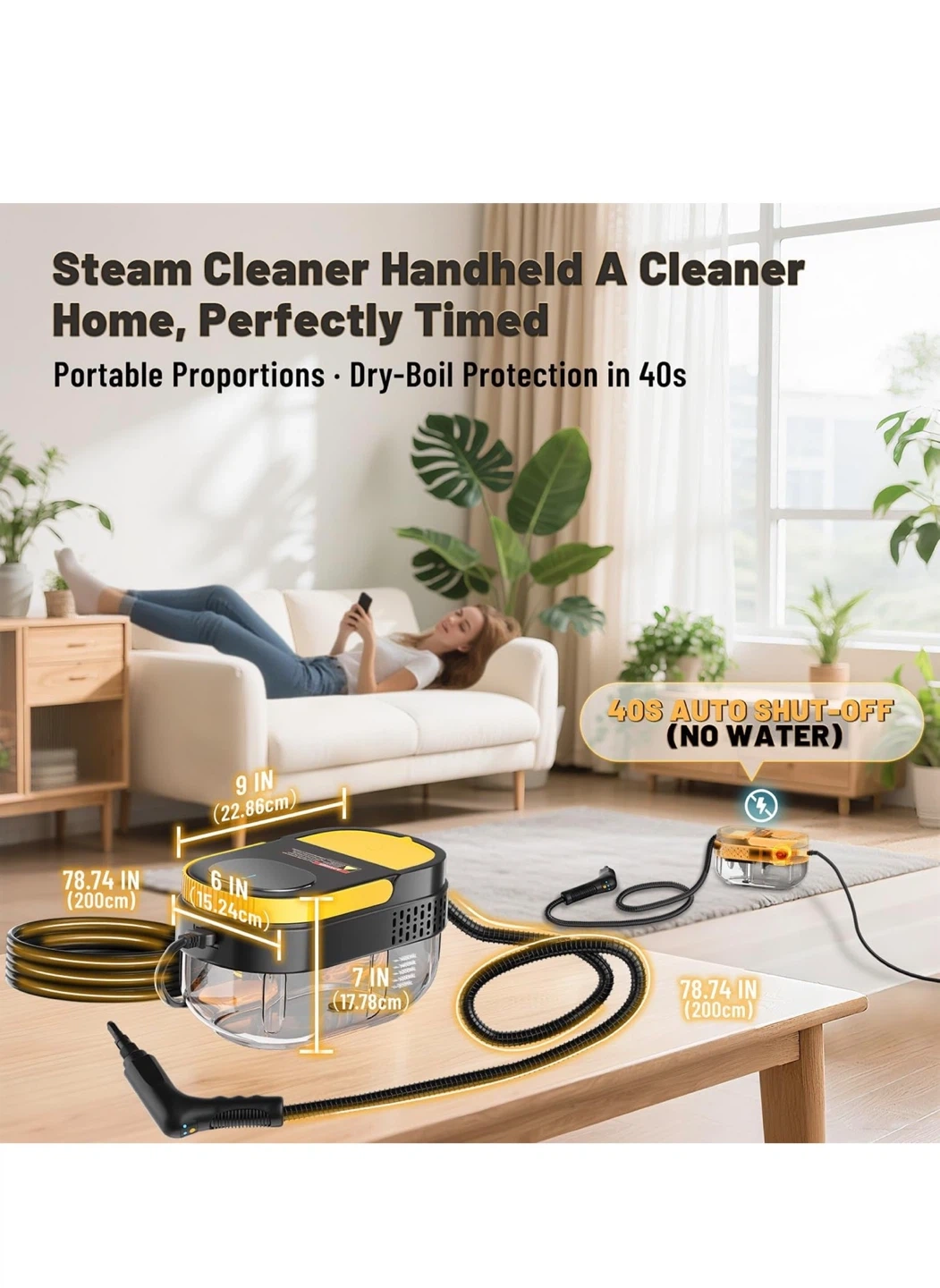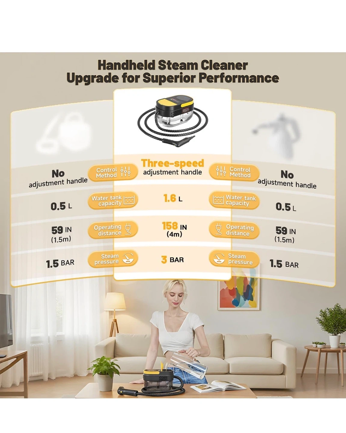 This handheld steam cleaner offers versatile cleaning applications for various surfaces. It features a 1.6L water tank capacity and a 158-inch cleaning radius. Includes a range of attachments for cleaning floors, grills, faucets, and more!