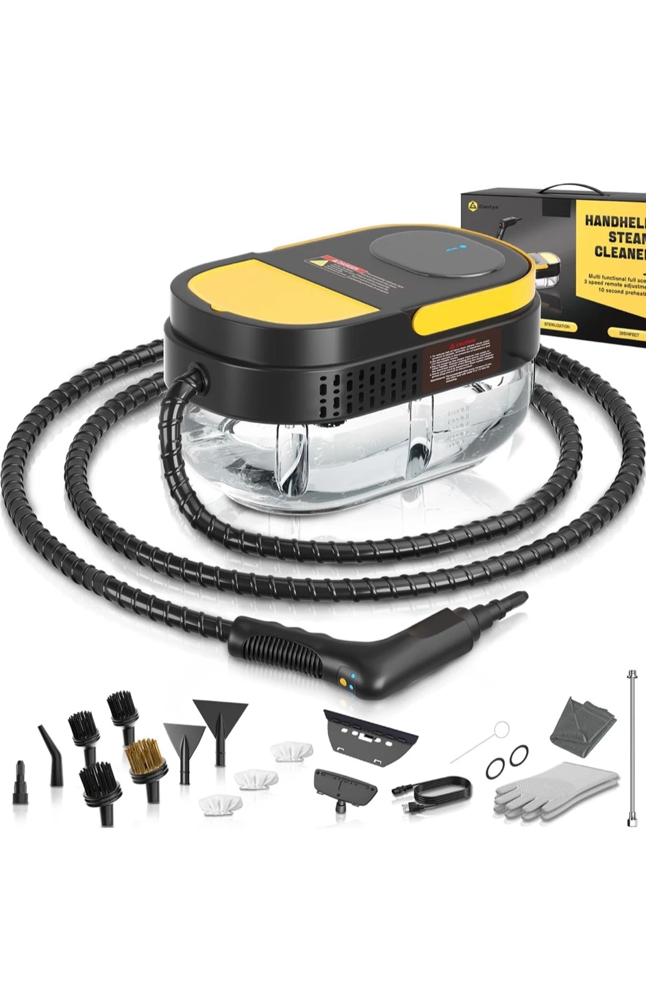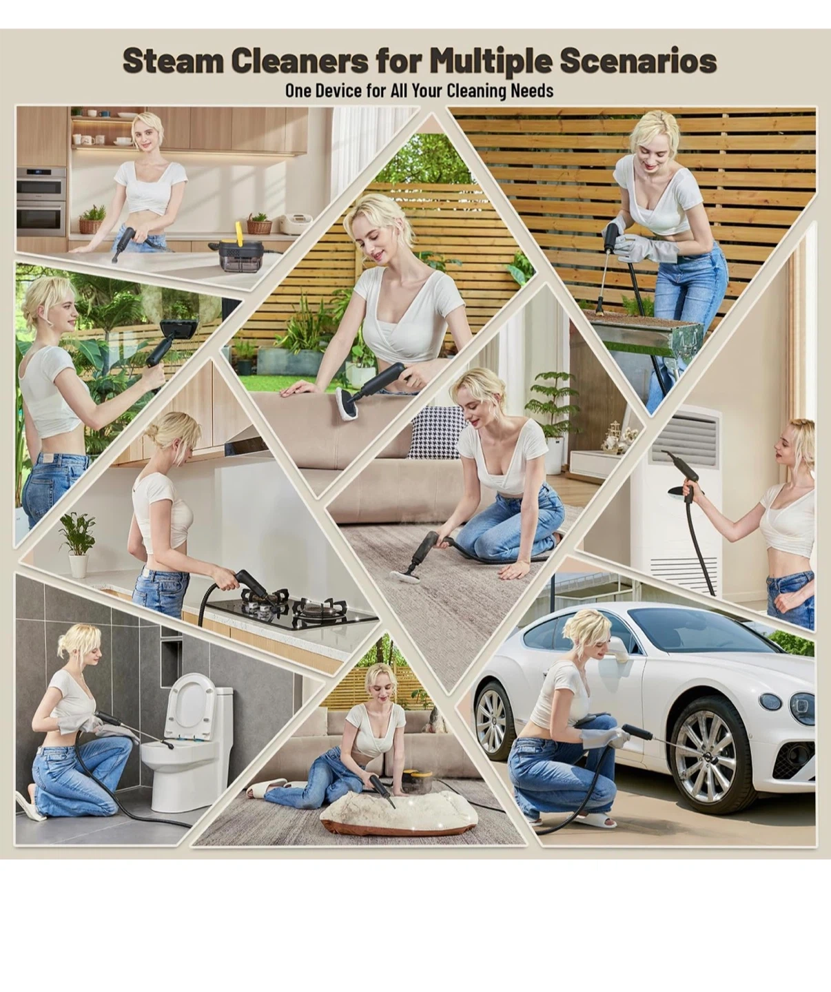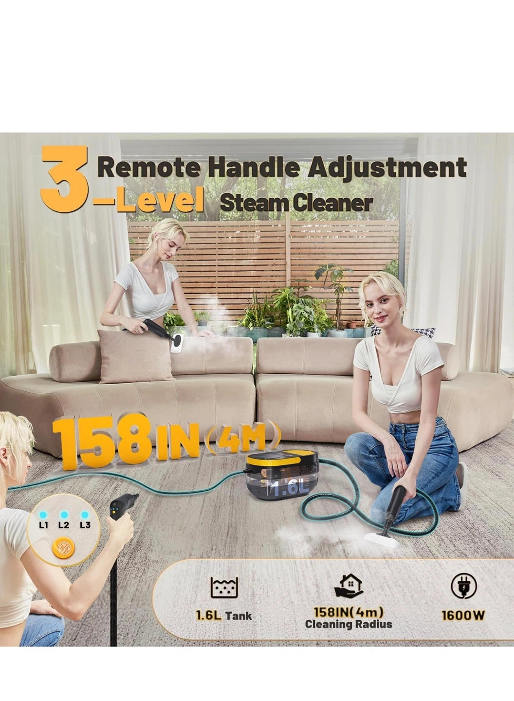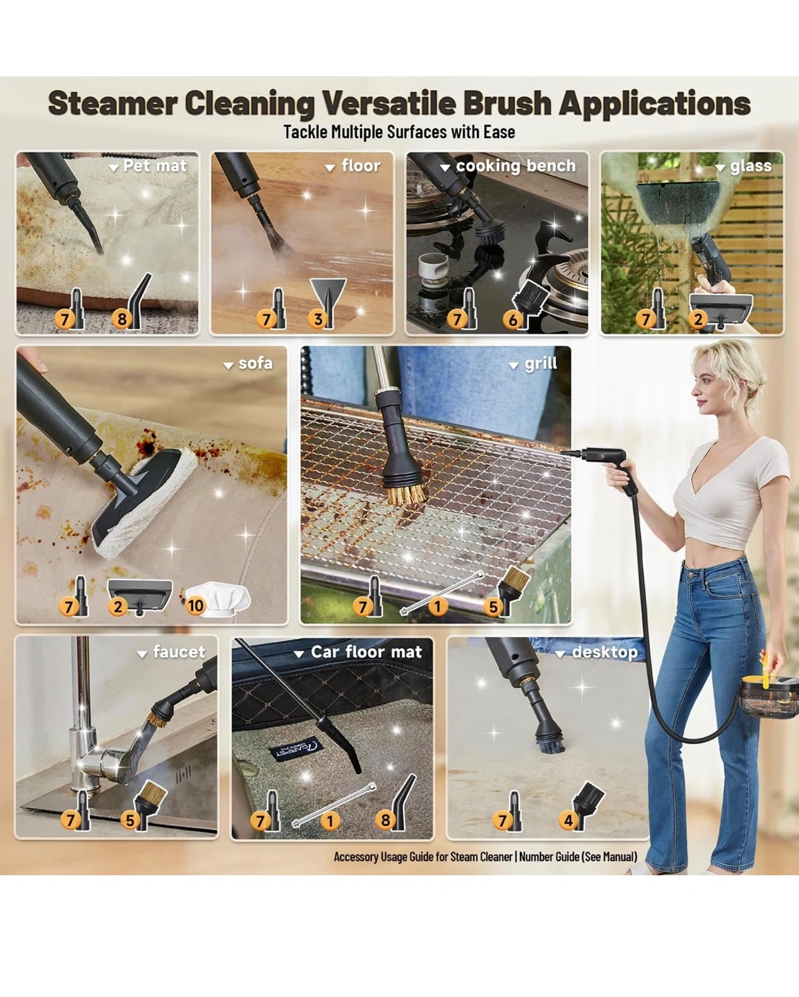 This handheld steam cleaner offers versatile cleaning applications for various surfaces. It features a 1.6L water tank capacity and a 158-inch cleaning radius. Includes a range of attachments for cleaning floors, grills, faucets, and more!