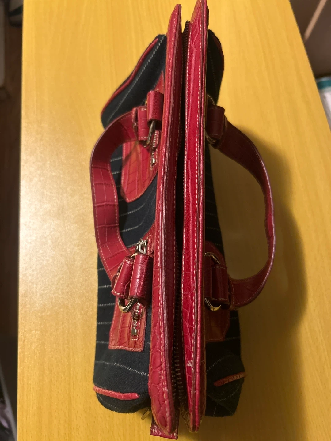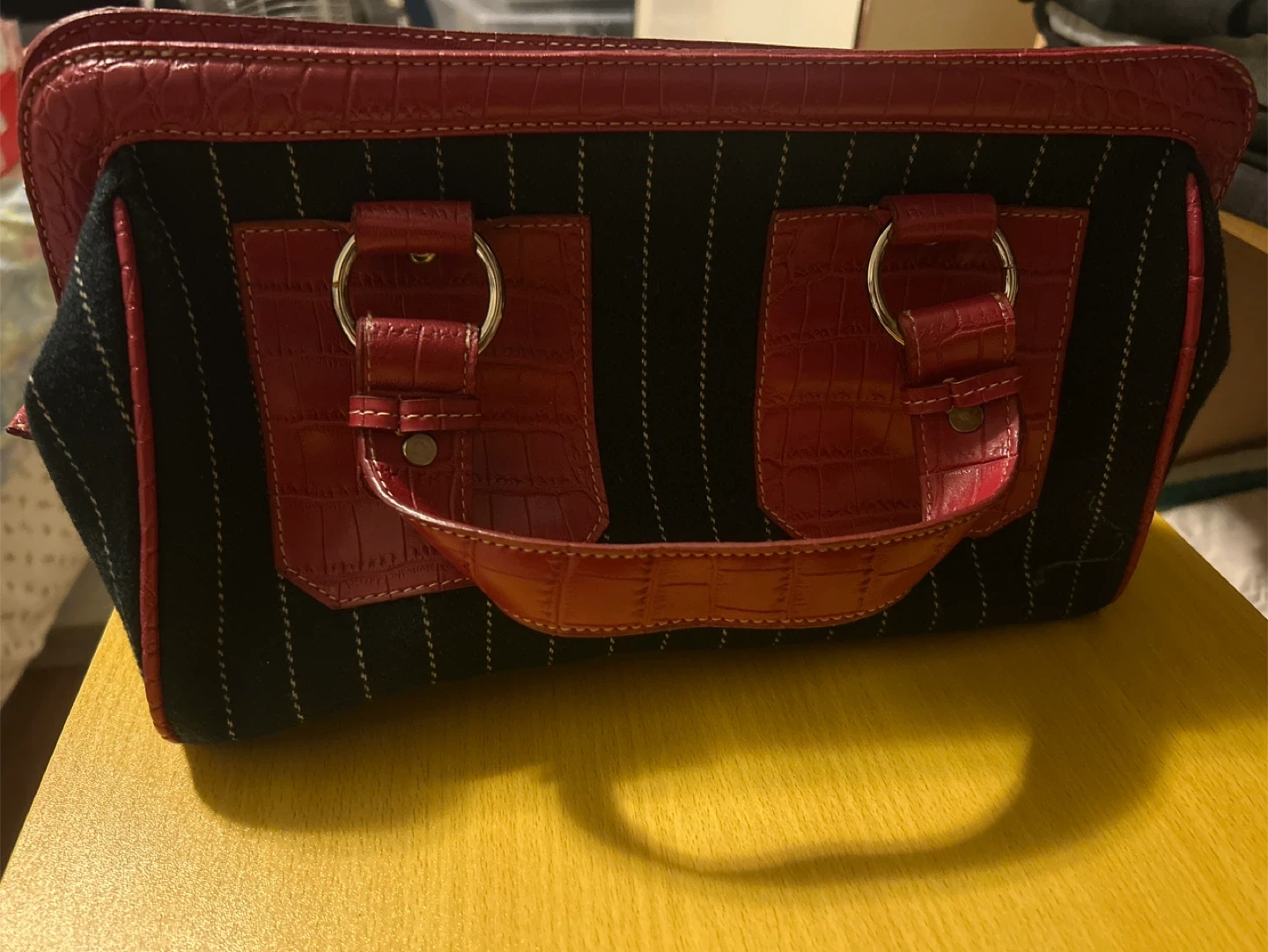 This stylish satchel handbag features a classic pinstripe design. It has red faux crocodile trim and silver-tone hardware. Zipper closure for security.