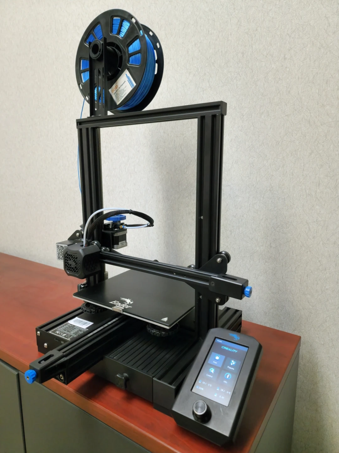 This Creality Ender 3 3D printer comes with an auto bed leveling sensor for easier setup. It's a reliable machine for all your printing needs. The printer includes a spool of blue filament and the original box for the BLTouch sensor is present.