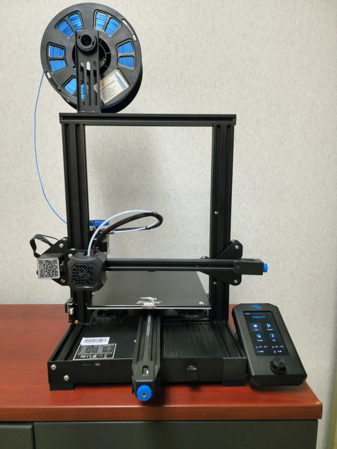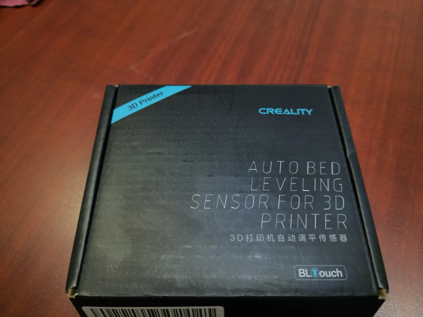 This Creality Ender 3 3D printer comes with an auto bed leveling sensor for easier setup. It's a reliable machine for all your printing needs. The printer includes a spool of blue filament and the original box for the BLTouch sensor is present.