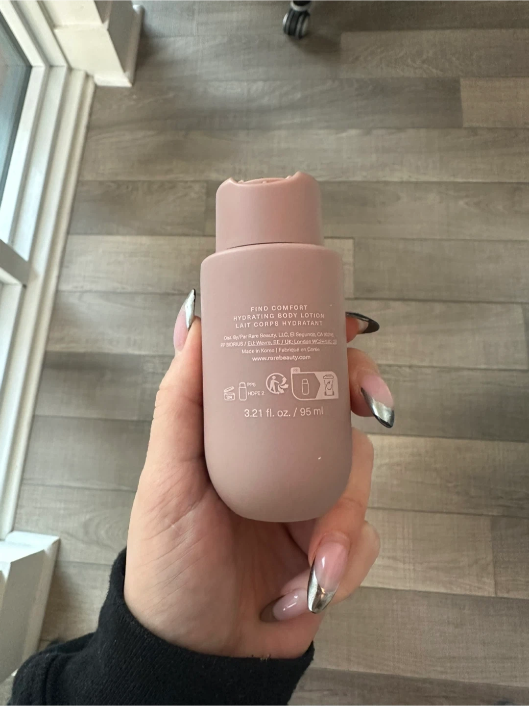Find comfort with Rare Beauty's hydrating body lotion. This lotion is 3.21 fl. oz. or 95 ml. It's a creamy, nourishing formula for your skin.