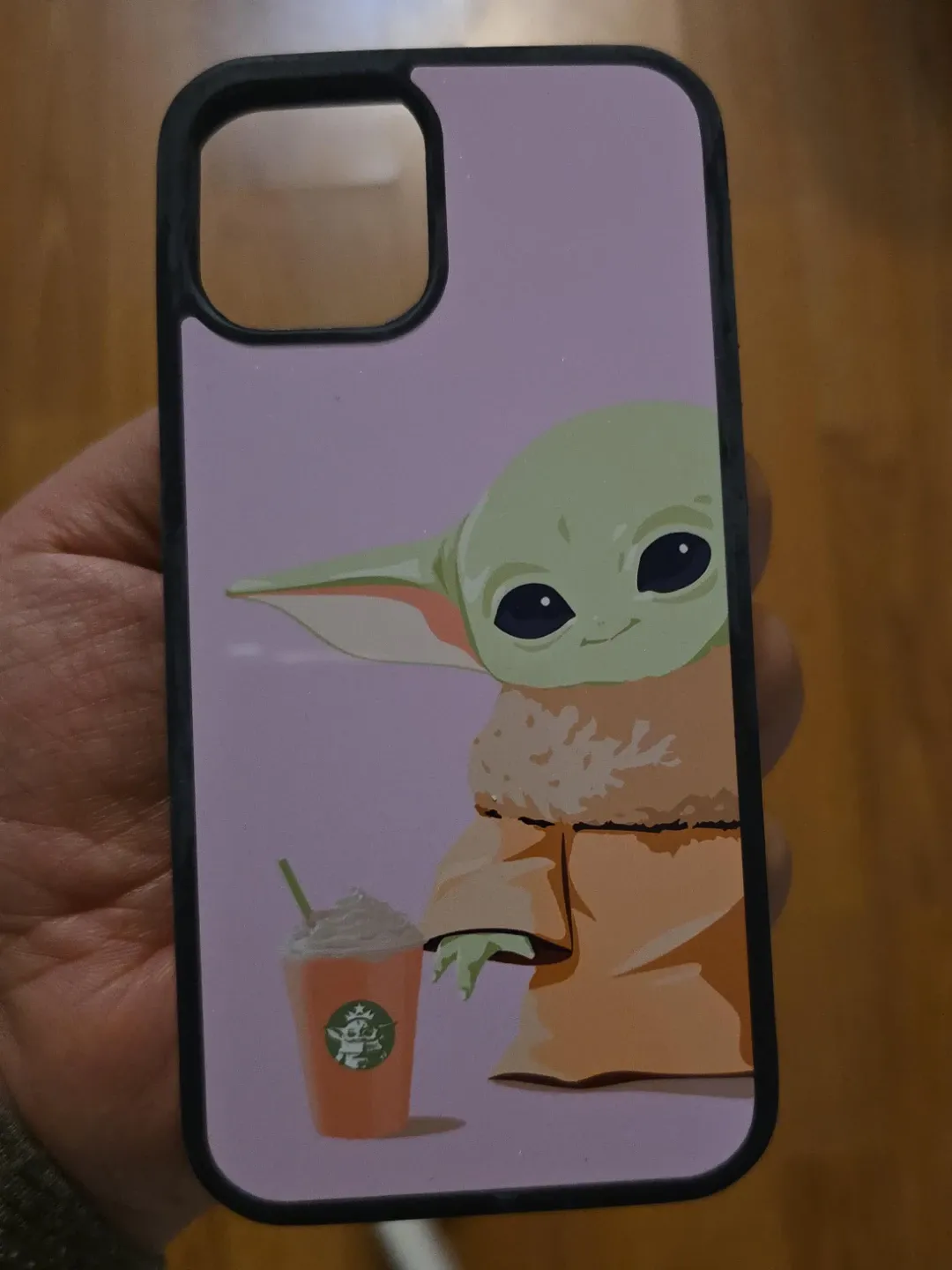 Selling a cute iPhone 12/12pro case featuring Baby Yoda with a Starbucks drink! It's in great condition and ready to protect your phone with style