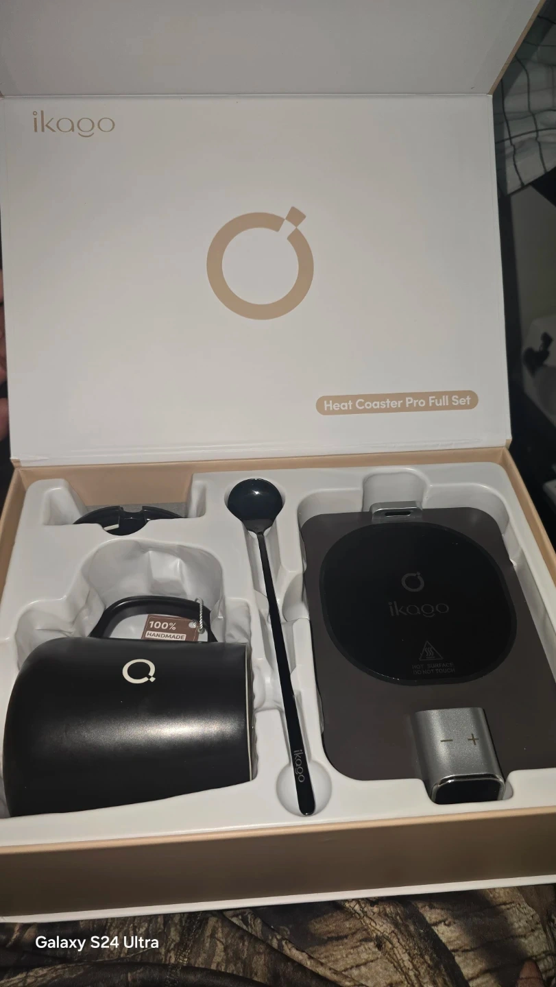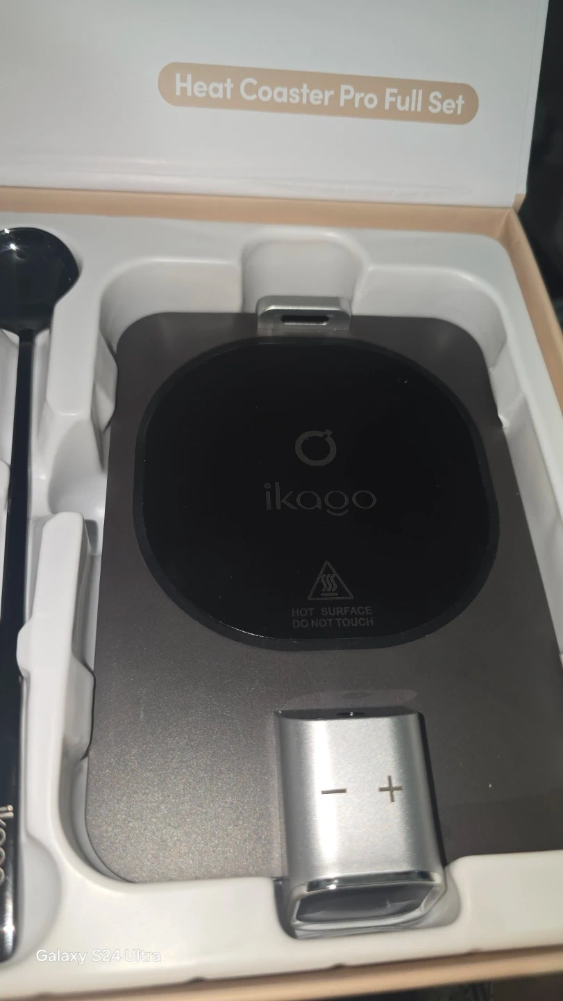 This Ikago Heat Coaster Pro set includes a mug and spoon. It's designed to keep your beverages warm. The set comes with a coaster that has temperature controls.