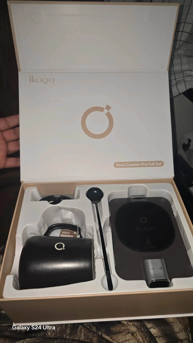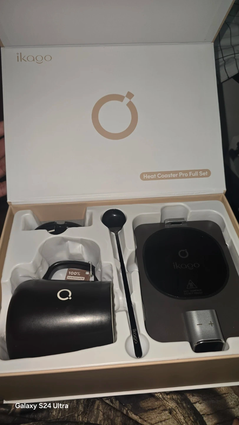 This Ikago Heat Coaster Pro set includes a mug and spoon. It's designed to keep your beverages warm. The set comes with a coaster that has temperature controls.