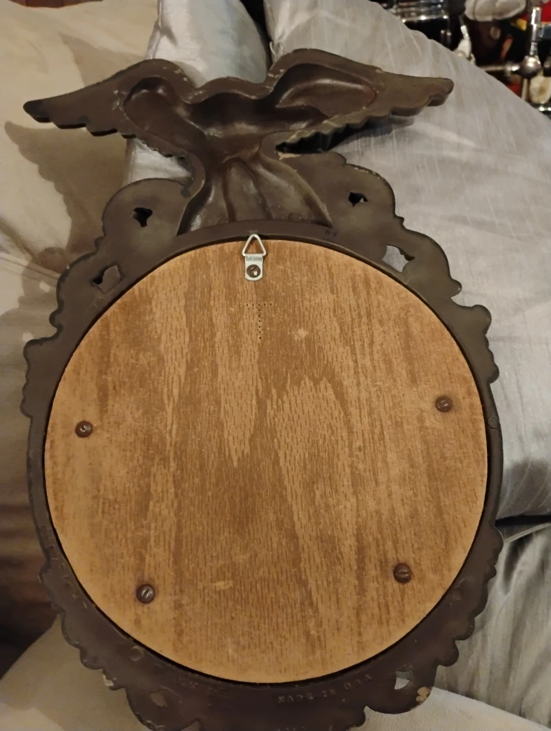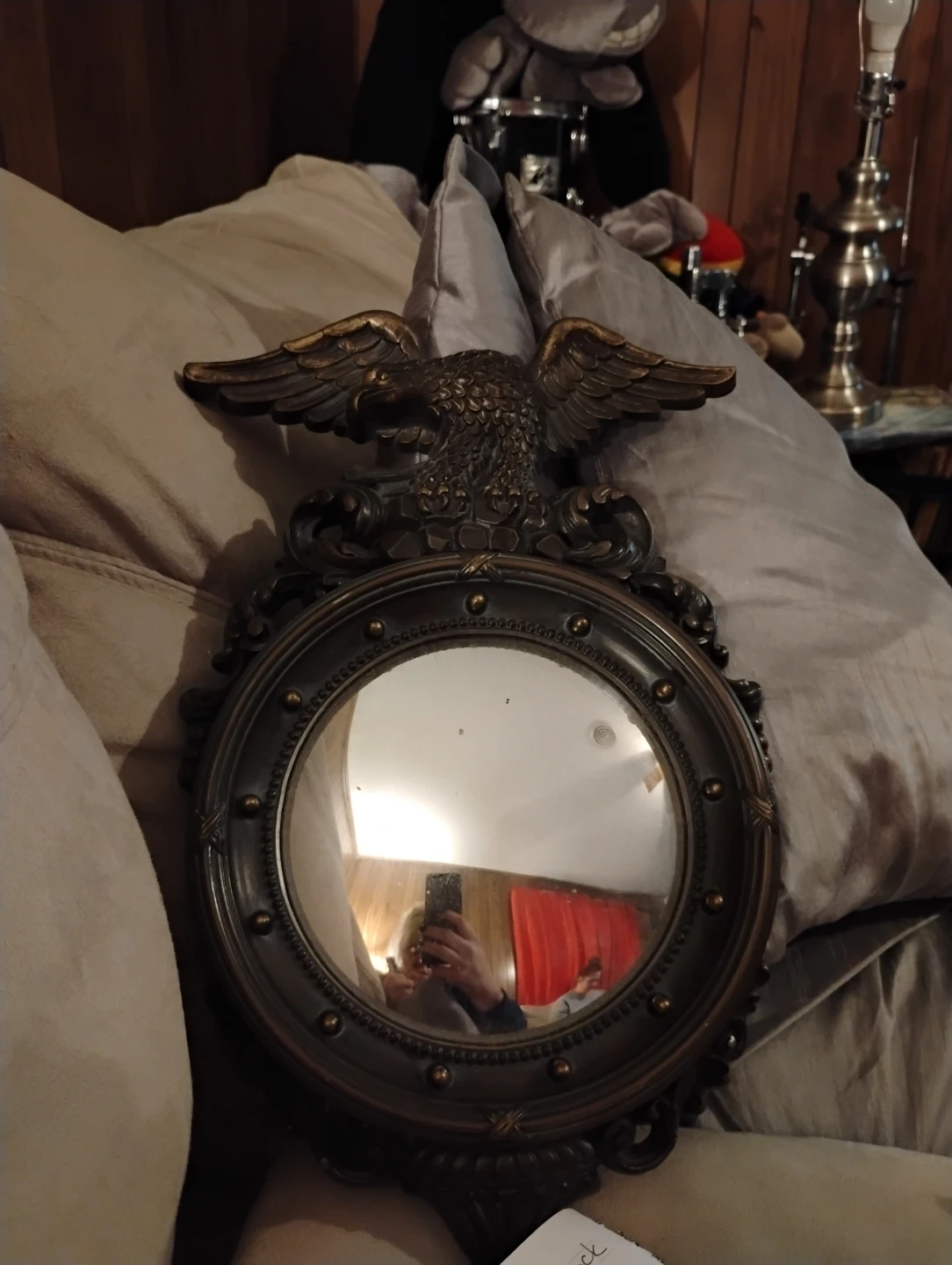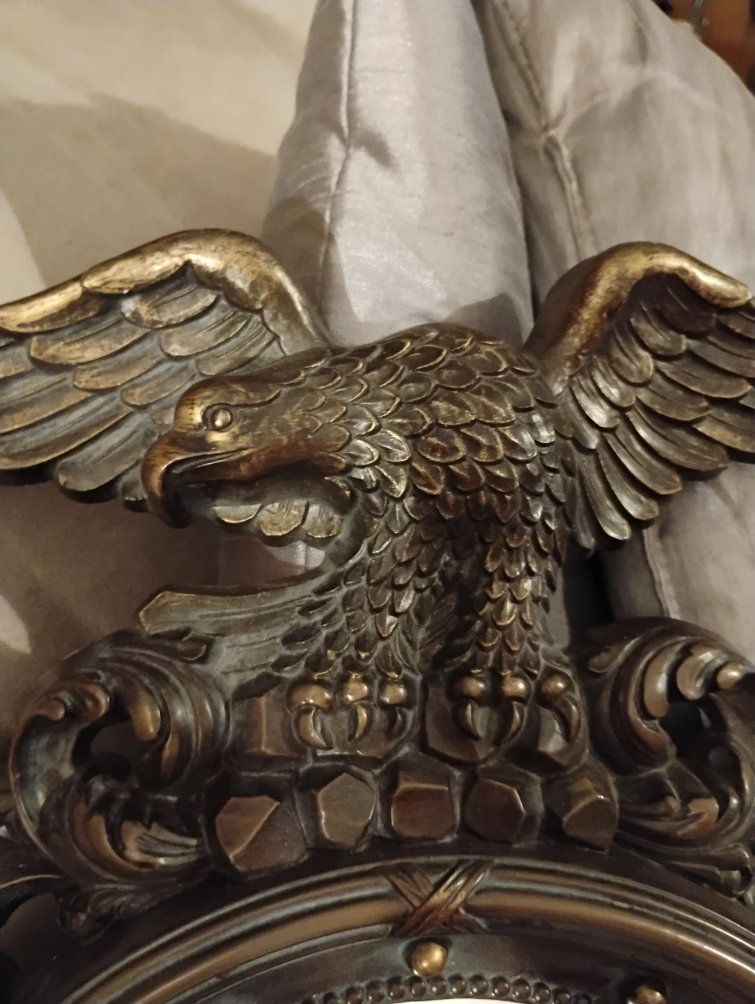Decorative wall mirror featuring a vintage-style brass eagle accent. This ornate piece adds a touch of classic elegance to any room. It's constructed from a durable metal frame with an antique finish.