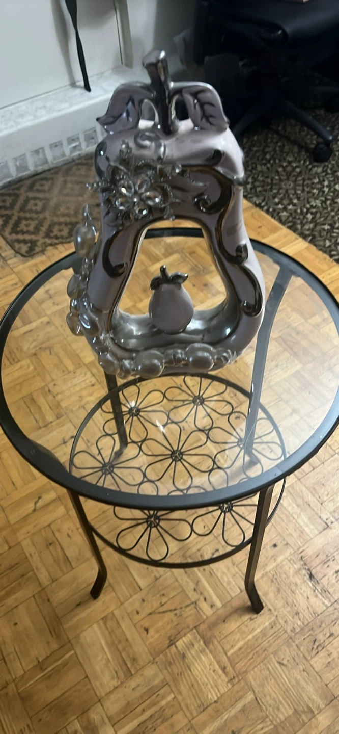 Round side table with a glass top and a decorative metal lower shelf. The metal frame has a dark finish with floral accents. It's a great accent piece for any room!