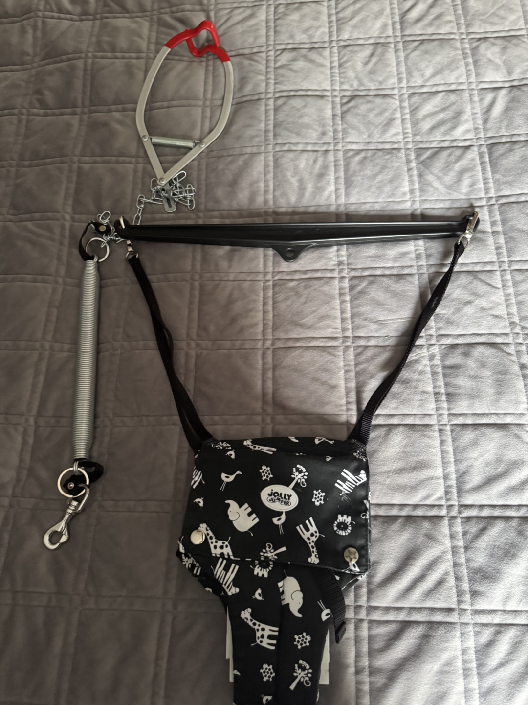 Baby jumper with spring, door frame attachment, and straps. Includes instructions and hardware. Black and white animal print.