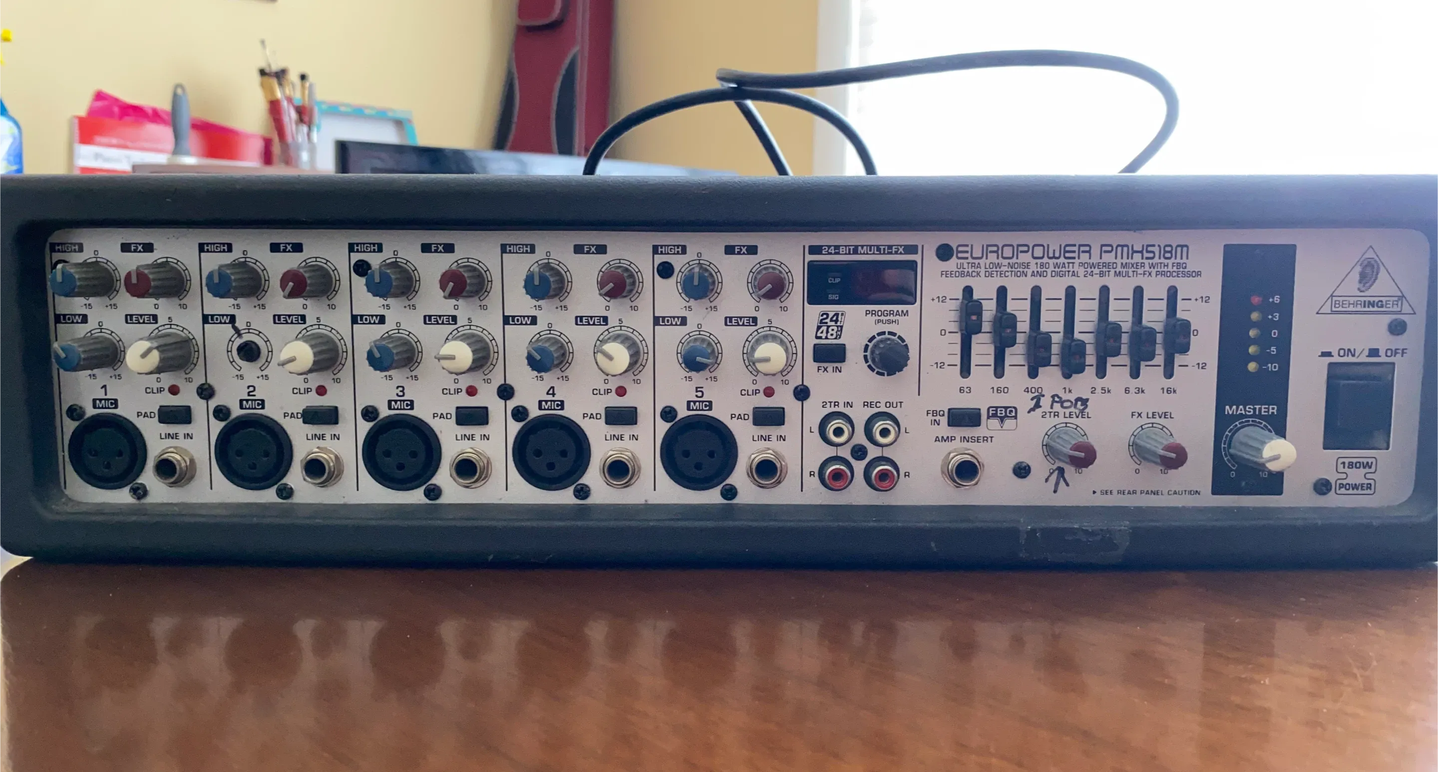 This Behringer EUROPOWER PMH518M is a 180 watt powered mixer with a 24-bit multi-fx processor. It has 5 mic/line inputs and a stereo input. This unit's amp insert allows for flexible patching. It's great for small gigs or practice spaces!