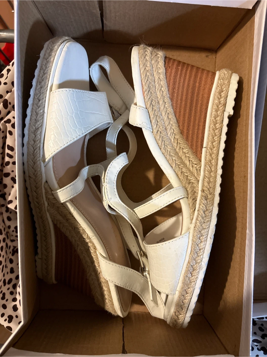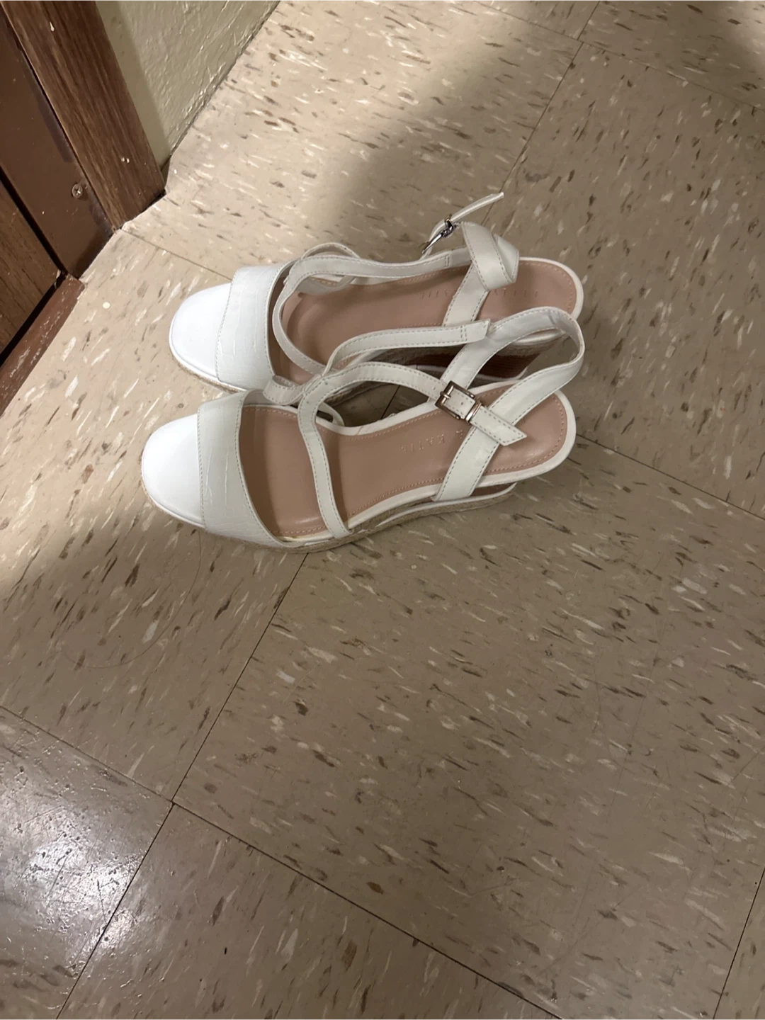 White Kelly & Katie wedge sandals with a textured toe strap. They feature adjustable ankle straps and a espadrille wedge sole. Size is 8.5M. Includes a shoe box!