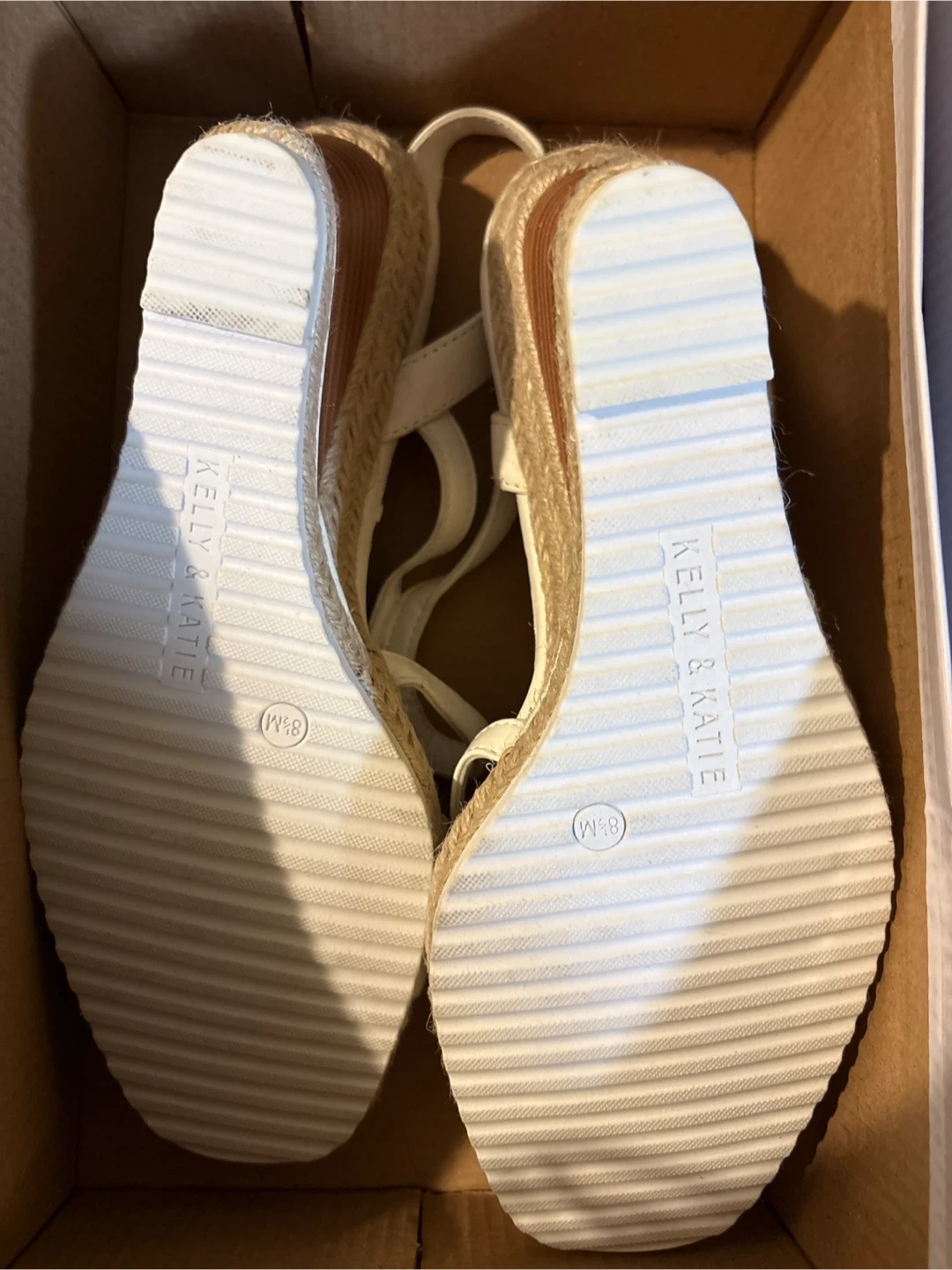 White Kelly & Katie wedge sandals with a textured toe strap. They feature adjustable ankle straps and a espadrille wedge sole. Size is 8.5M. Includes a shoe box!