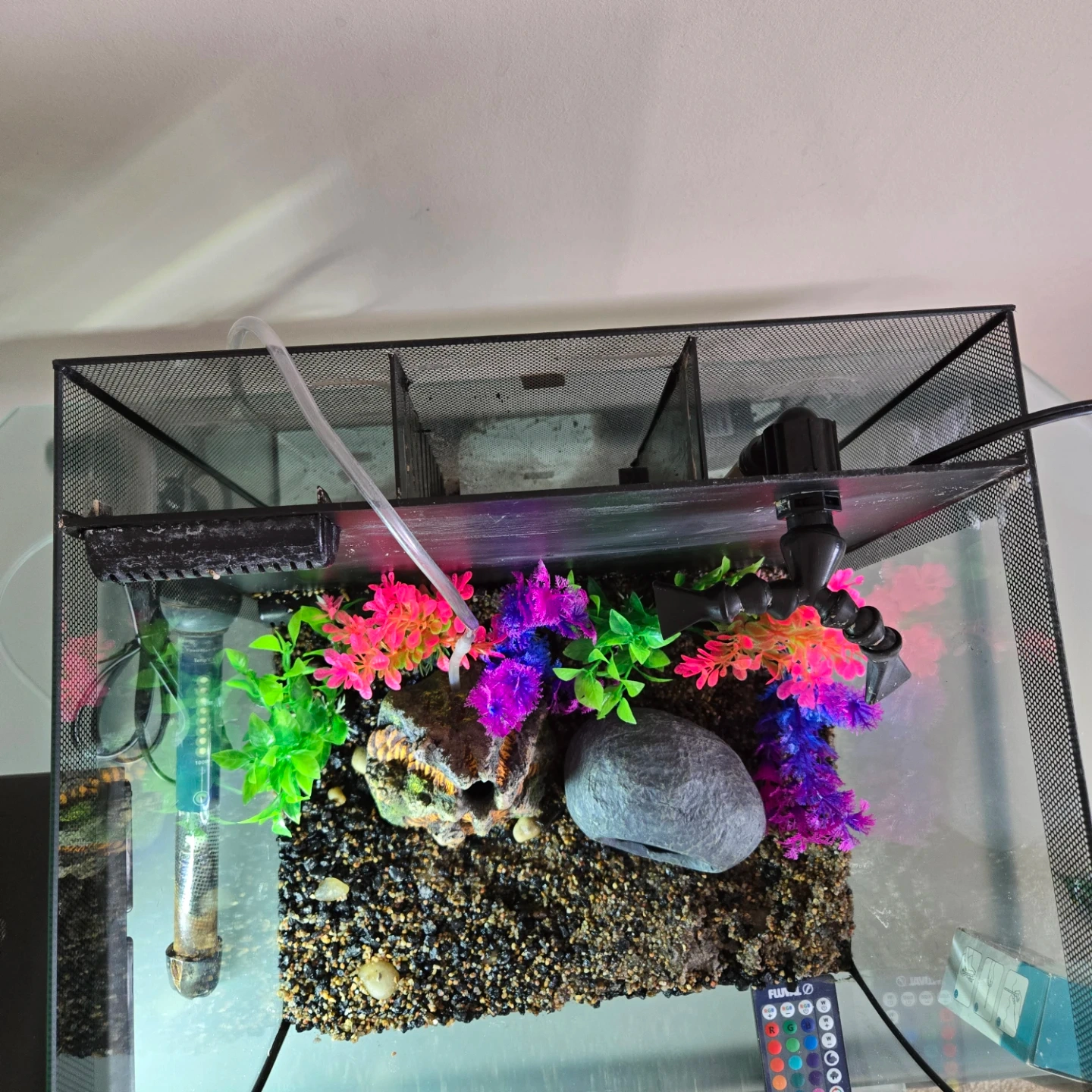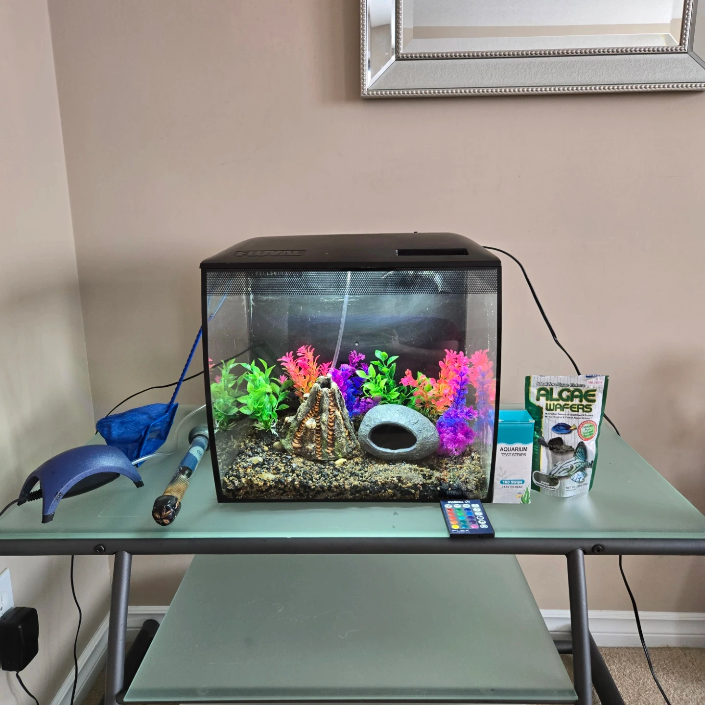 This fish tank is great for so many types of fish. It has a built in filter in the back and comes with filter media that I have in a container with water to keep the beneficial bacteria so you get a cycled filter.