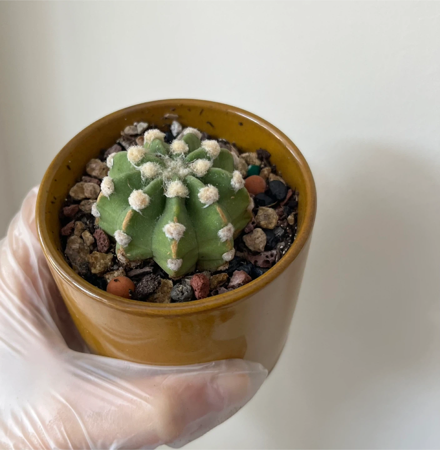 A small green cactus sits in a round, ochre-toned ceramic pot. It's potted with a mix of colourful stones. This plant's fuzzy white areoles stand out against its ribbed green body.