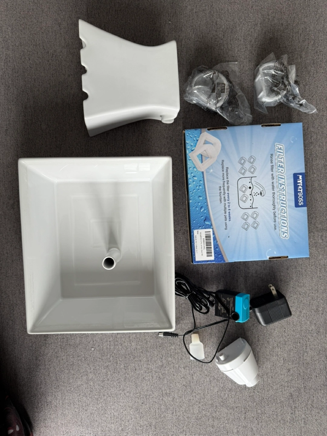 Still in good condition, some faint carbon stains from use with the carbon filter over time. The fountain is not completely silent, it has some faint water noises, but our cats were fine with that and drank from it!
