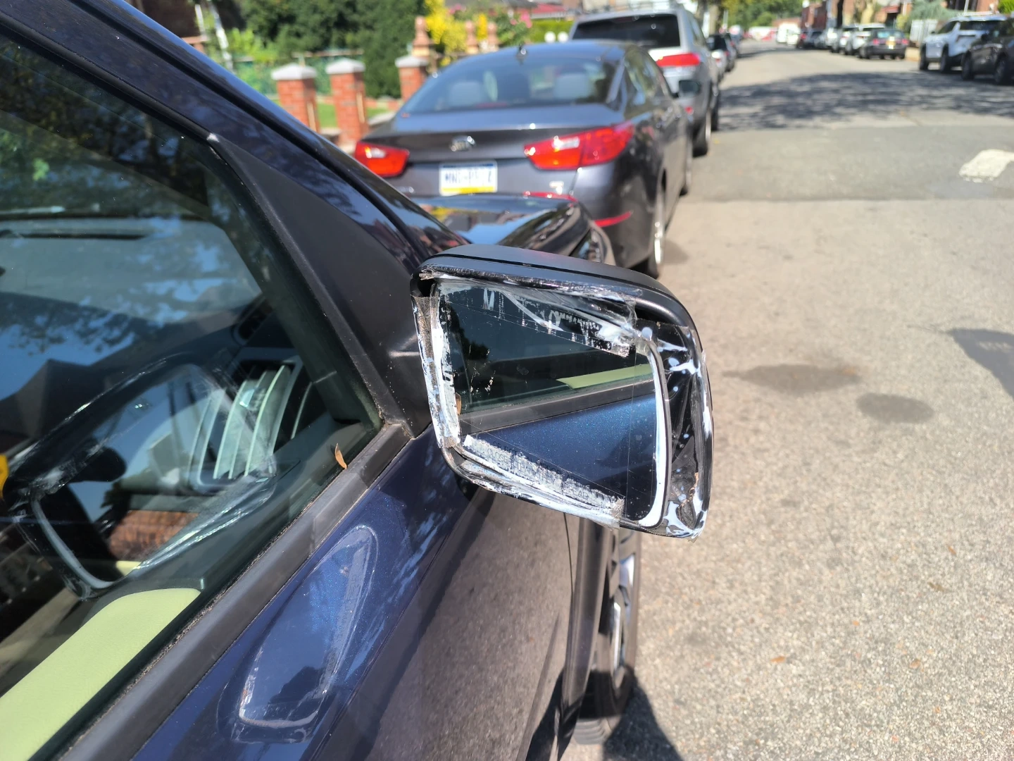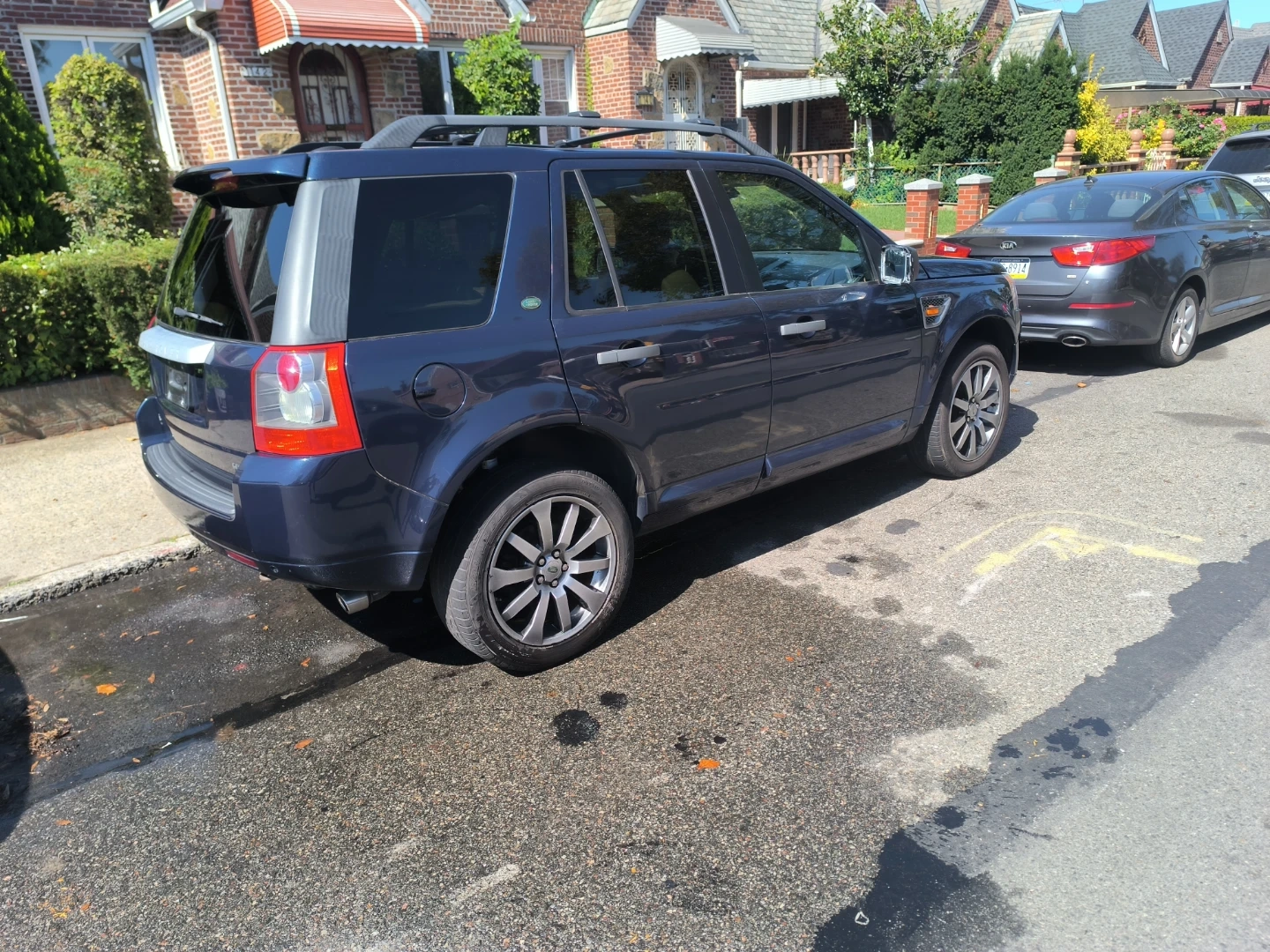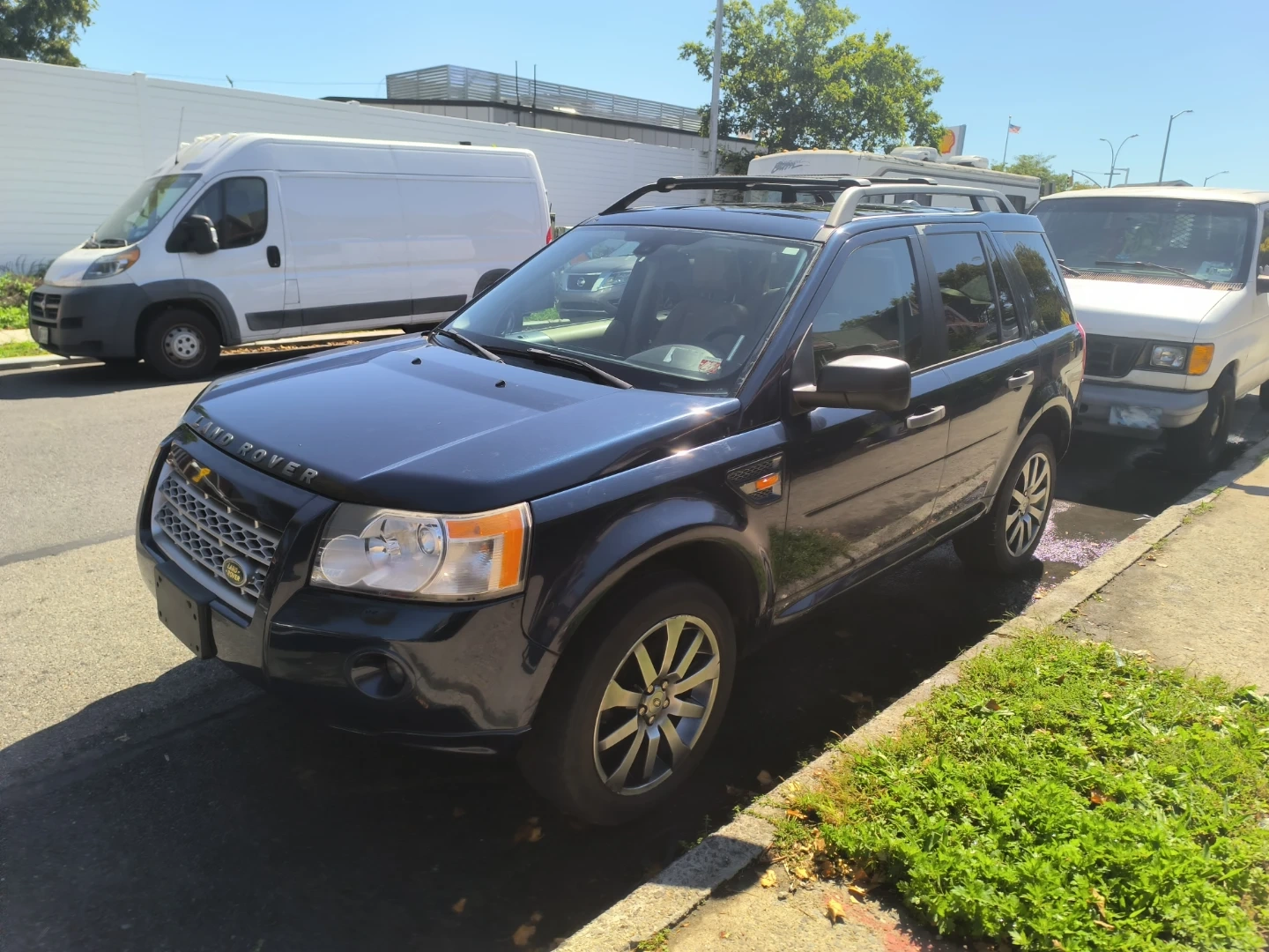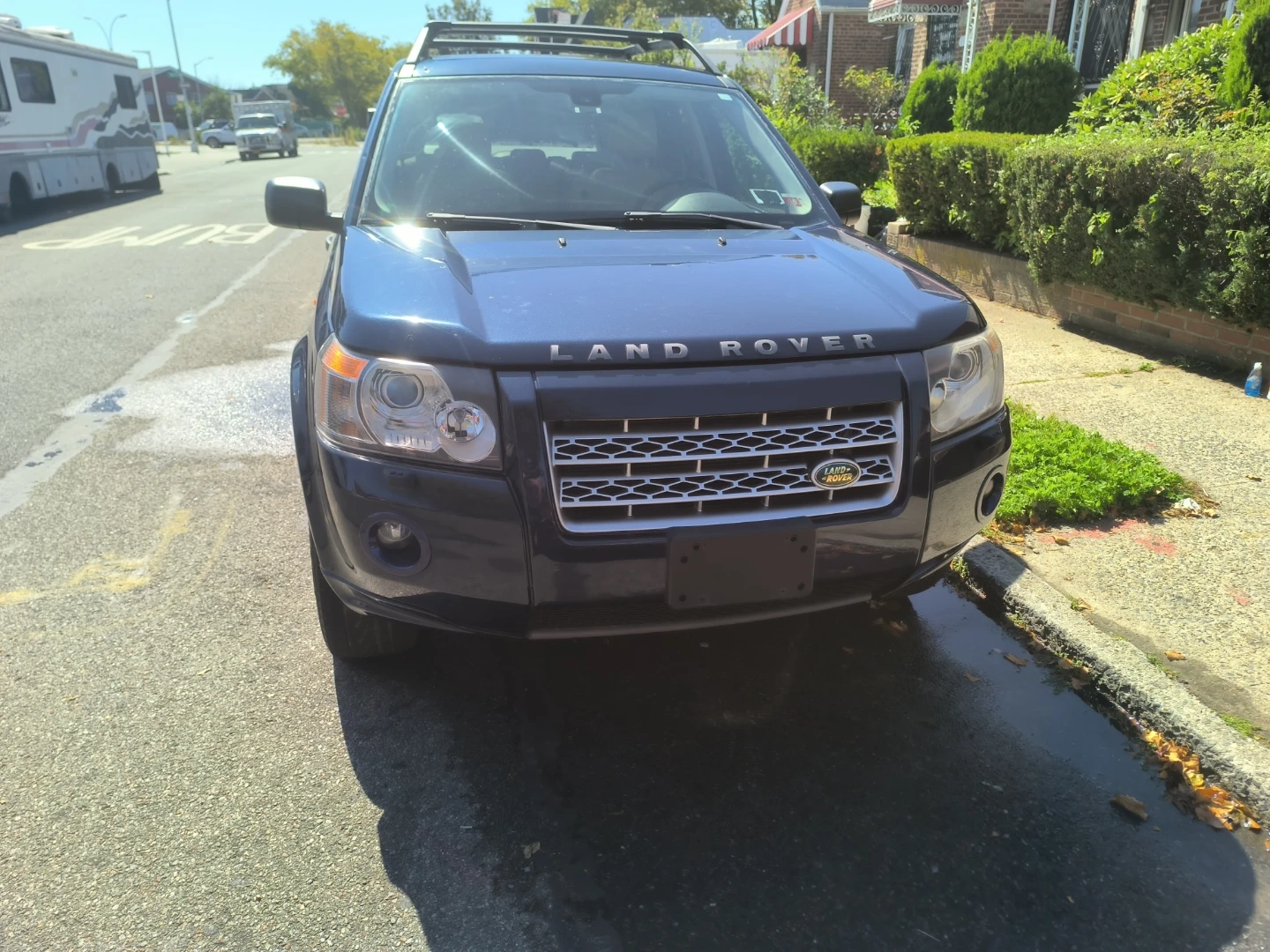 This is a blue Land Rover LR2 SUV. It has a damaged side mirror. The exterior is blue and it has roof rails. Very low miles-92k.. extra clean interior...All wheel drive SUV..