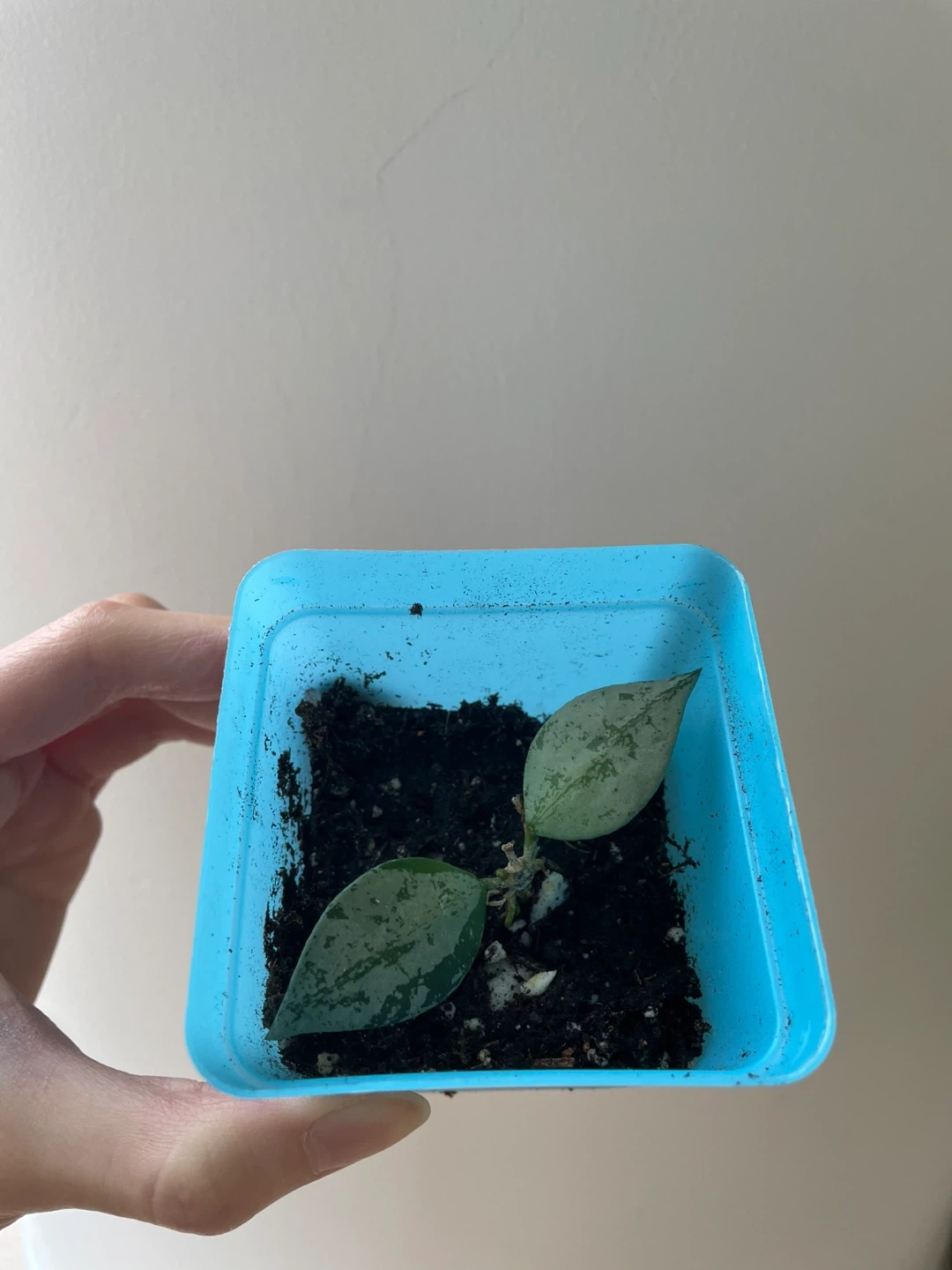 Hoya plant with two leaves in a blue plastic pot. It’s called Hoya krohniana super silver or eskimo or arctic. It has high silver variegation. It’s well rooted