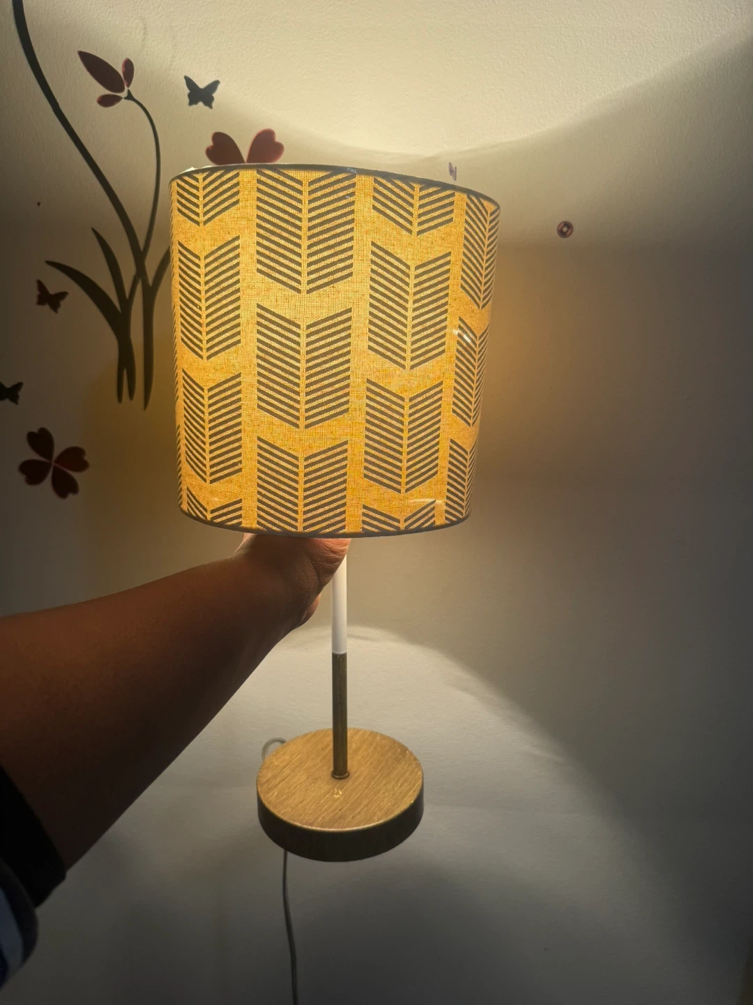 Here's a cute table lamp with a patterned shade! It has a wooden base and would look great in any room. The shade features a stylish design, adding a touch of personality to your space