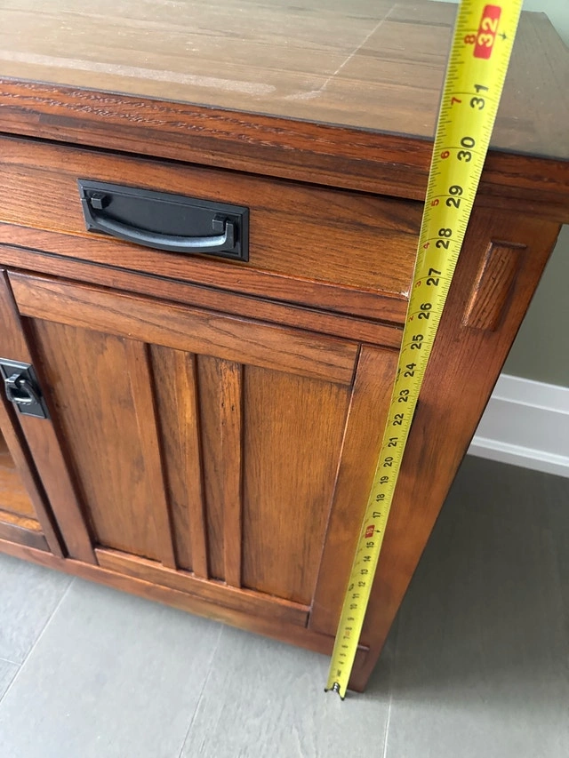 This is a used, but well-maintained solid wood media console that offers both style and functionality for your entertainment setup. The console features a warm, rich finish and ample storage options, including drawers, shelves, and a cabinet. Table shelves are available.