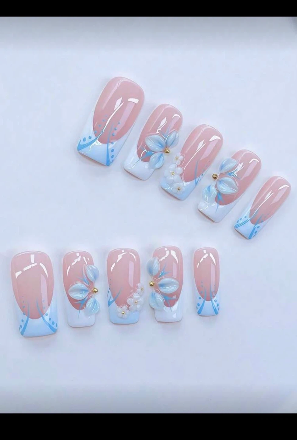 A set of press-on nails featuring a French tip design with light blue and white accents. These nails are decorated with delicate blue and white 3D floral embellishments and small gold beads. They're ready to give your fingertips a charming, elegant look!