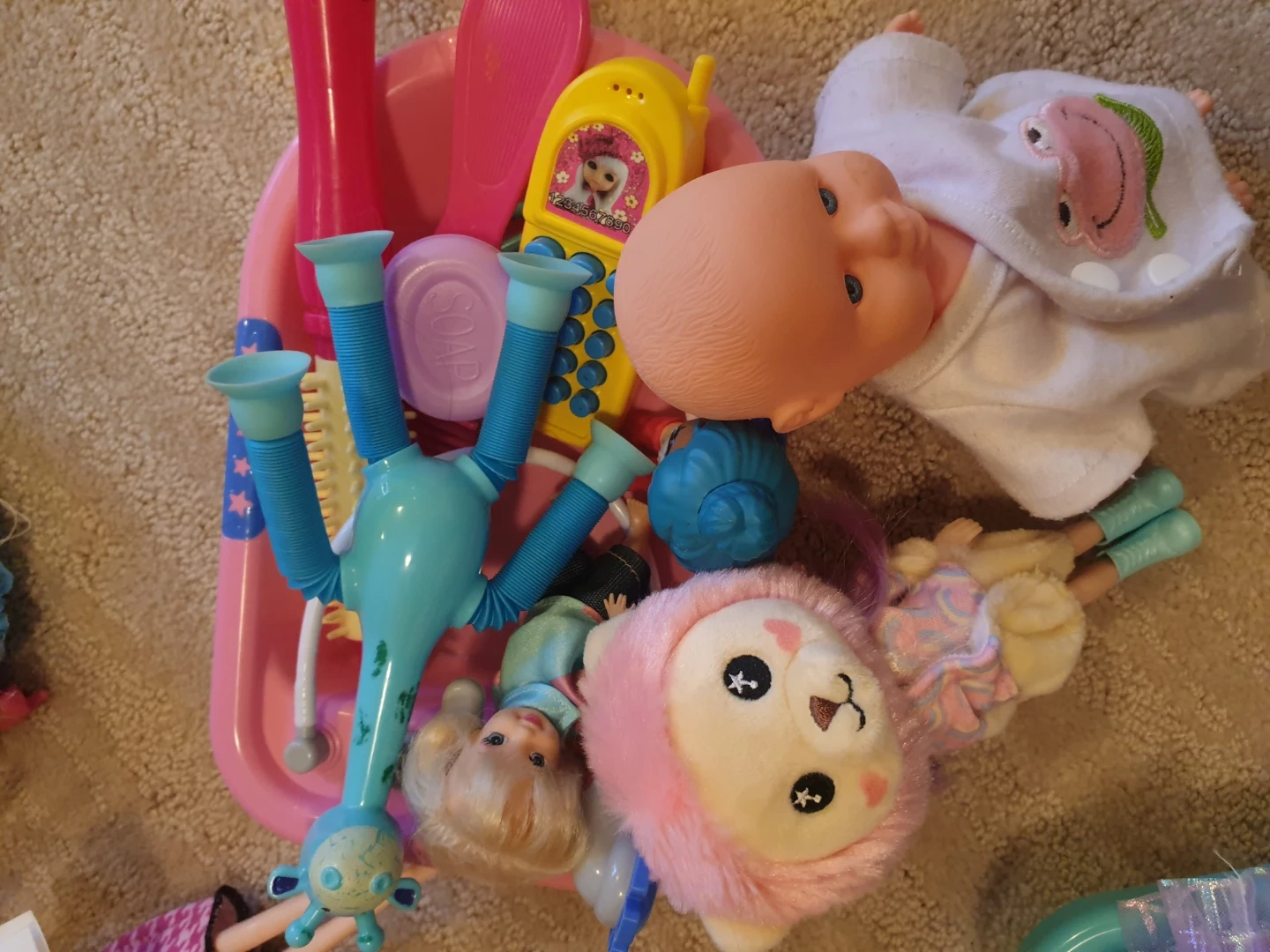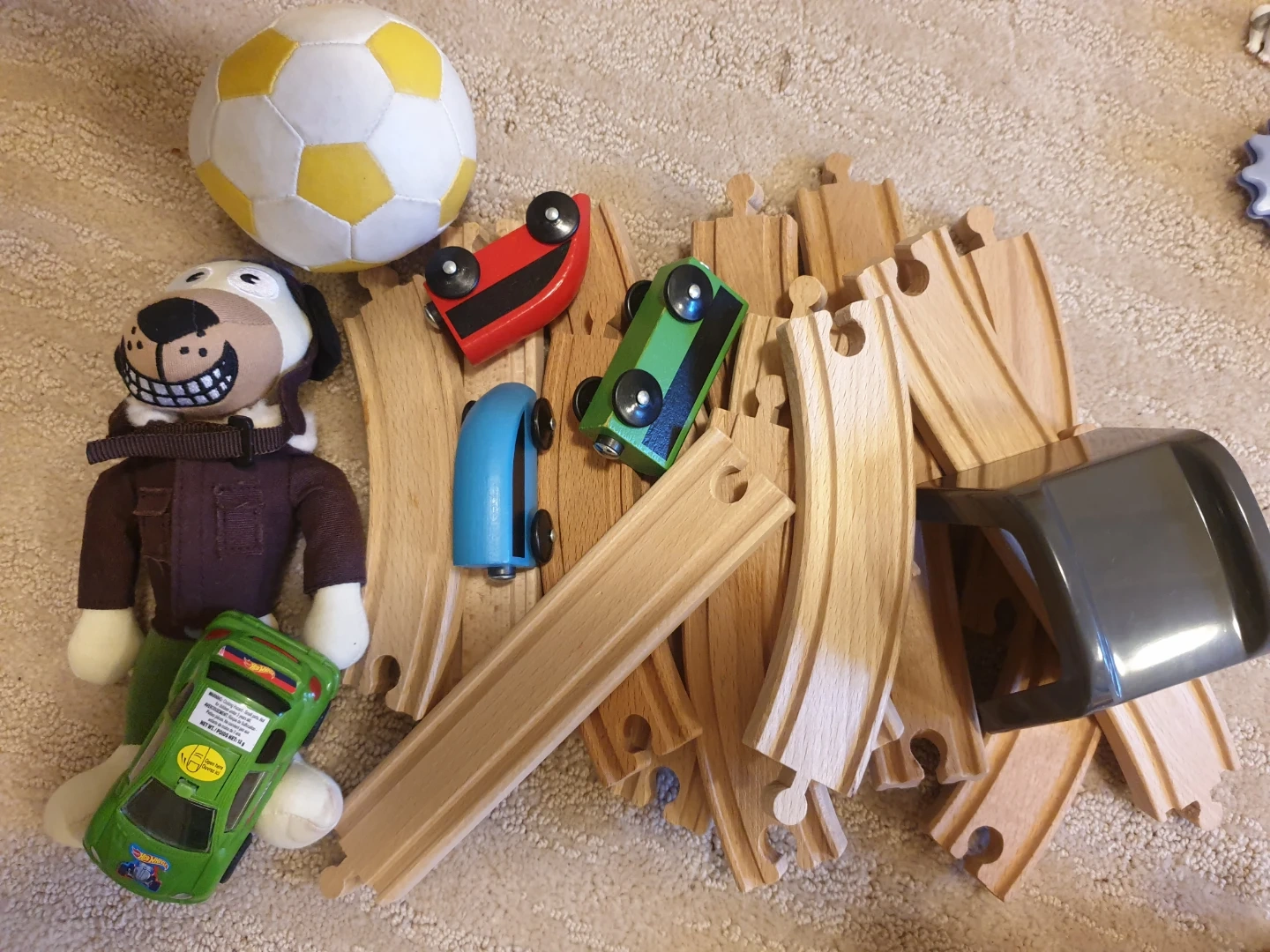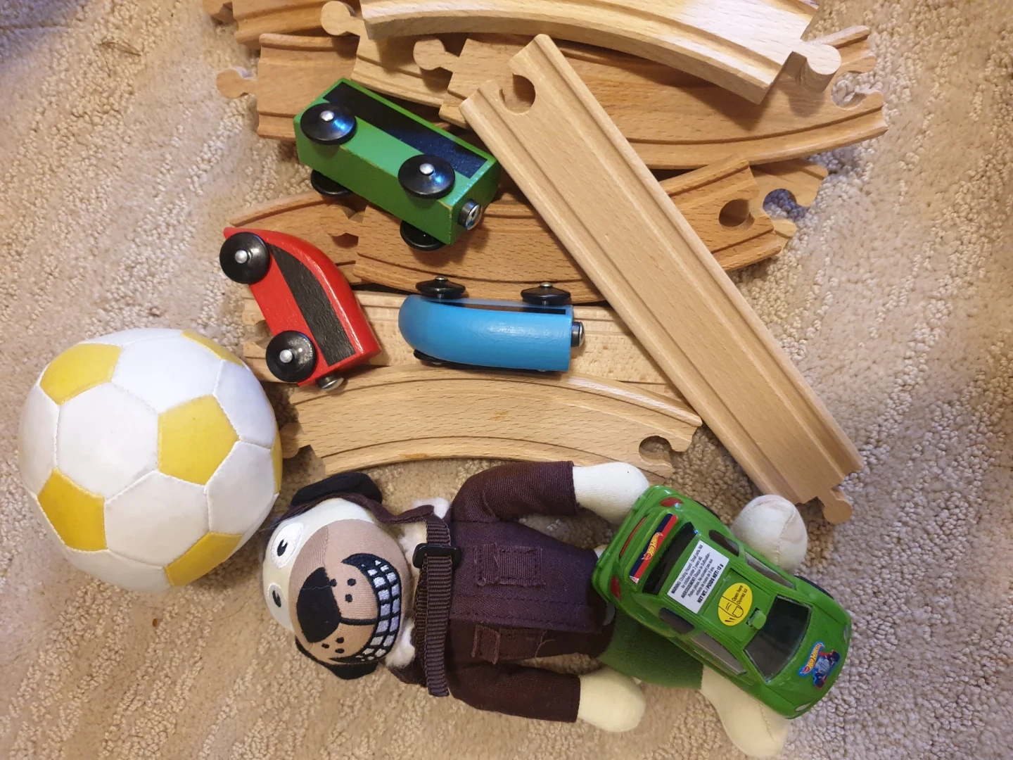 Includes a three toy cars including one Hot Wheels, two soccer balls, and a set of wooden train track pieces. There's also a pink play tub with various mini toys like a doll, a yellow toy phone, and bath accessories.