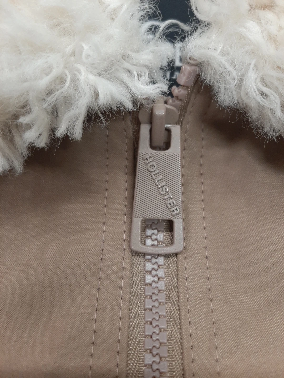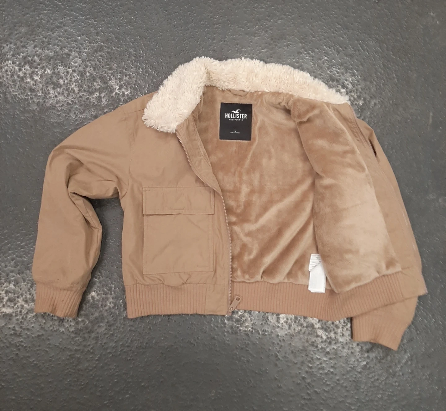 Selling a Hollister jacket in size large. It's a tan colour with a fuzzy collar and lining. It has pockets on the front and a zipper closure
