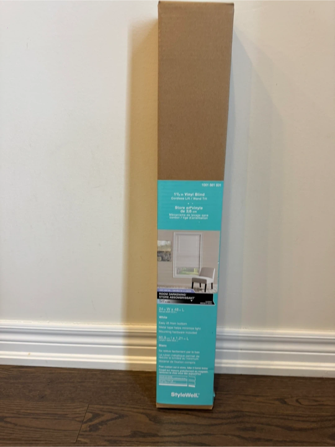 This is a 1 3/8 inch vinyl blind with cordless lift and wand tilt. It's white and measures 24 inches wide by 48 inches long. This room darkening blind offers total obscurity.