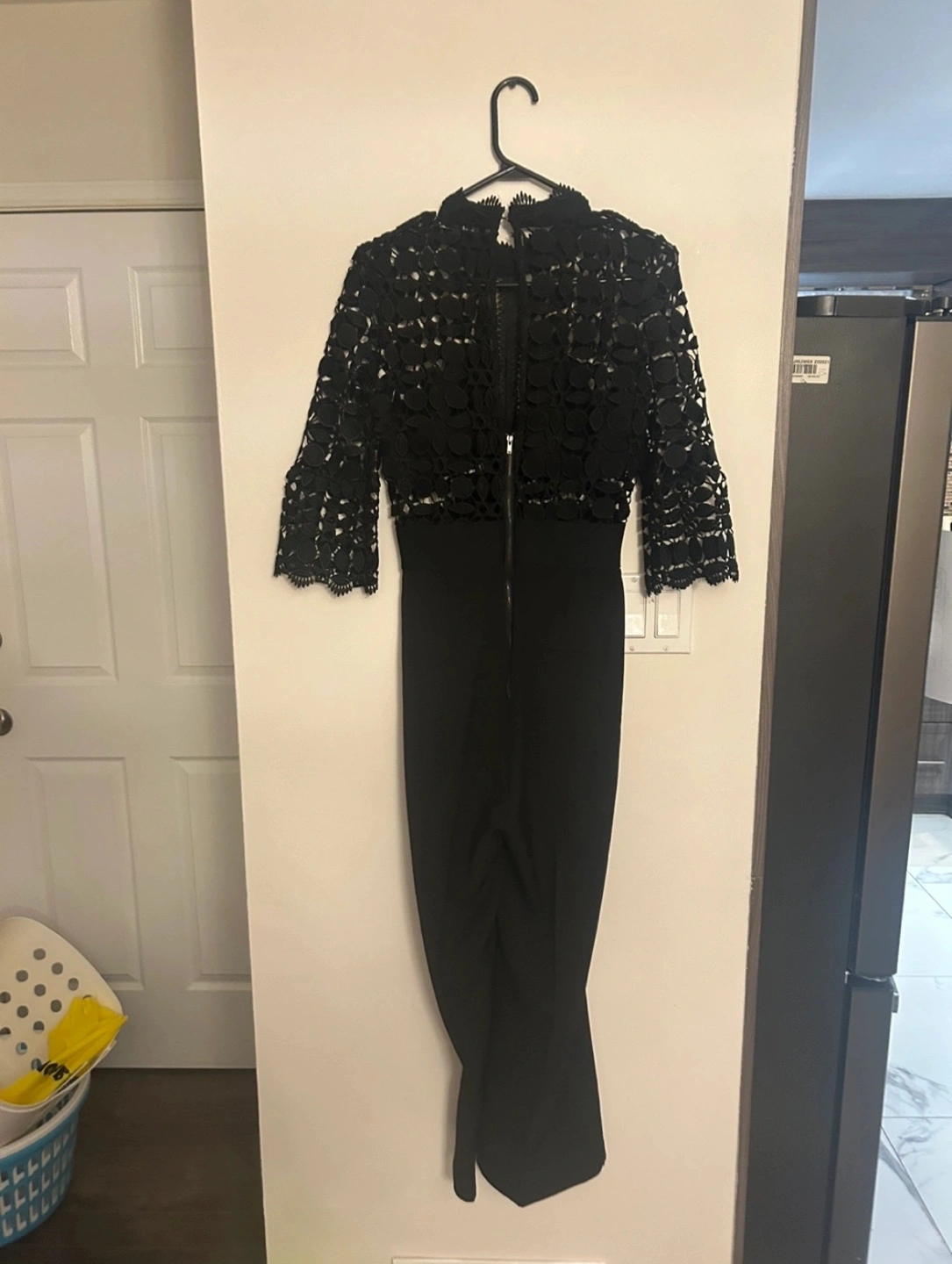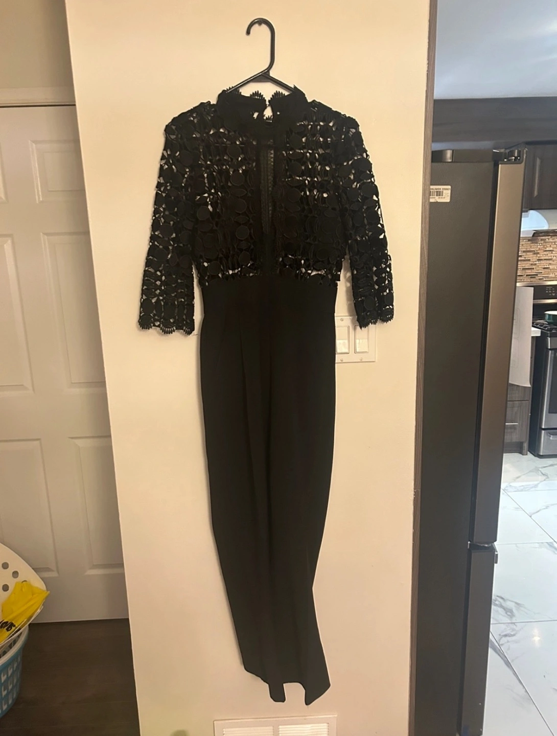 Elegant black jumpsuit. Features a beautiful lace overlay bodice and a solid crepe bottom. Three-quarter sleeves. High neckline. Zipper closure. Perfect for special occasions.