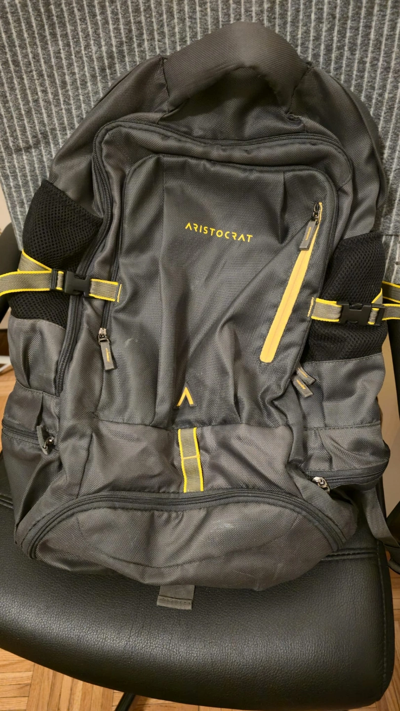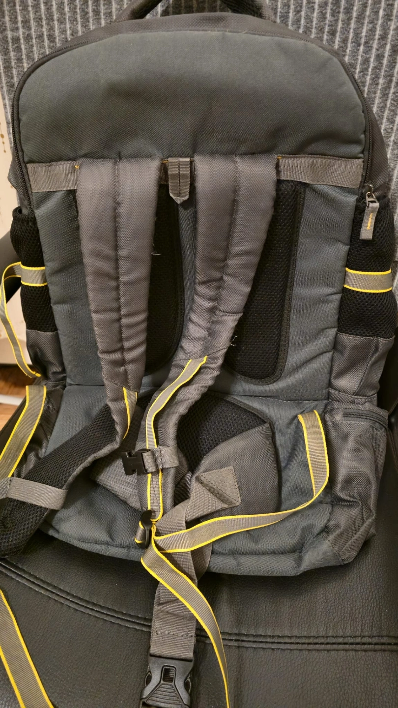 Large grey backpack. Yellow accents. Multiple pockets and compartments. Adjustable straps. Durable material. Great for travel or everyday use. Multiple pockets, apt for camping!