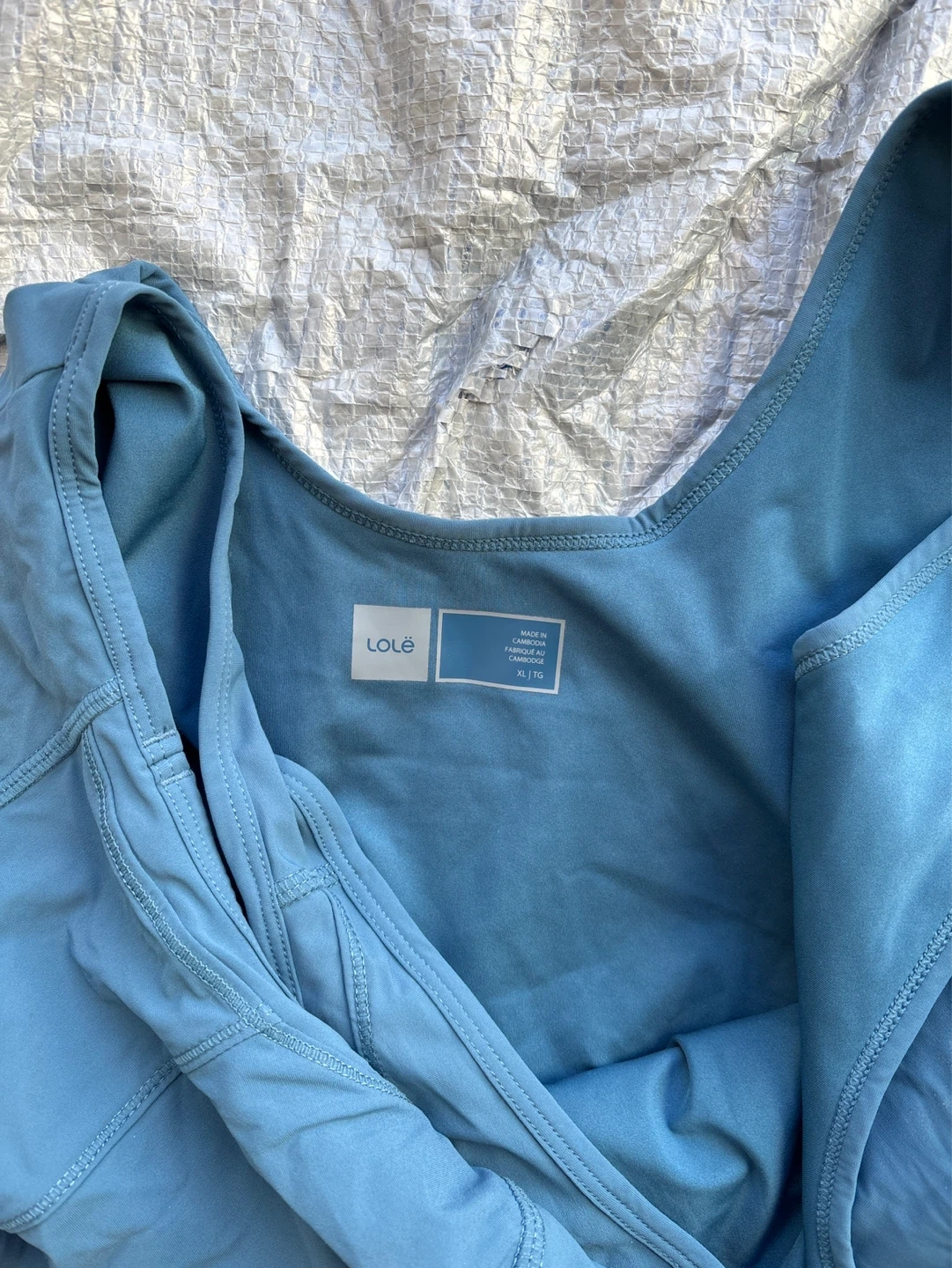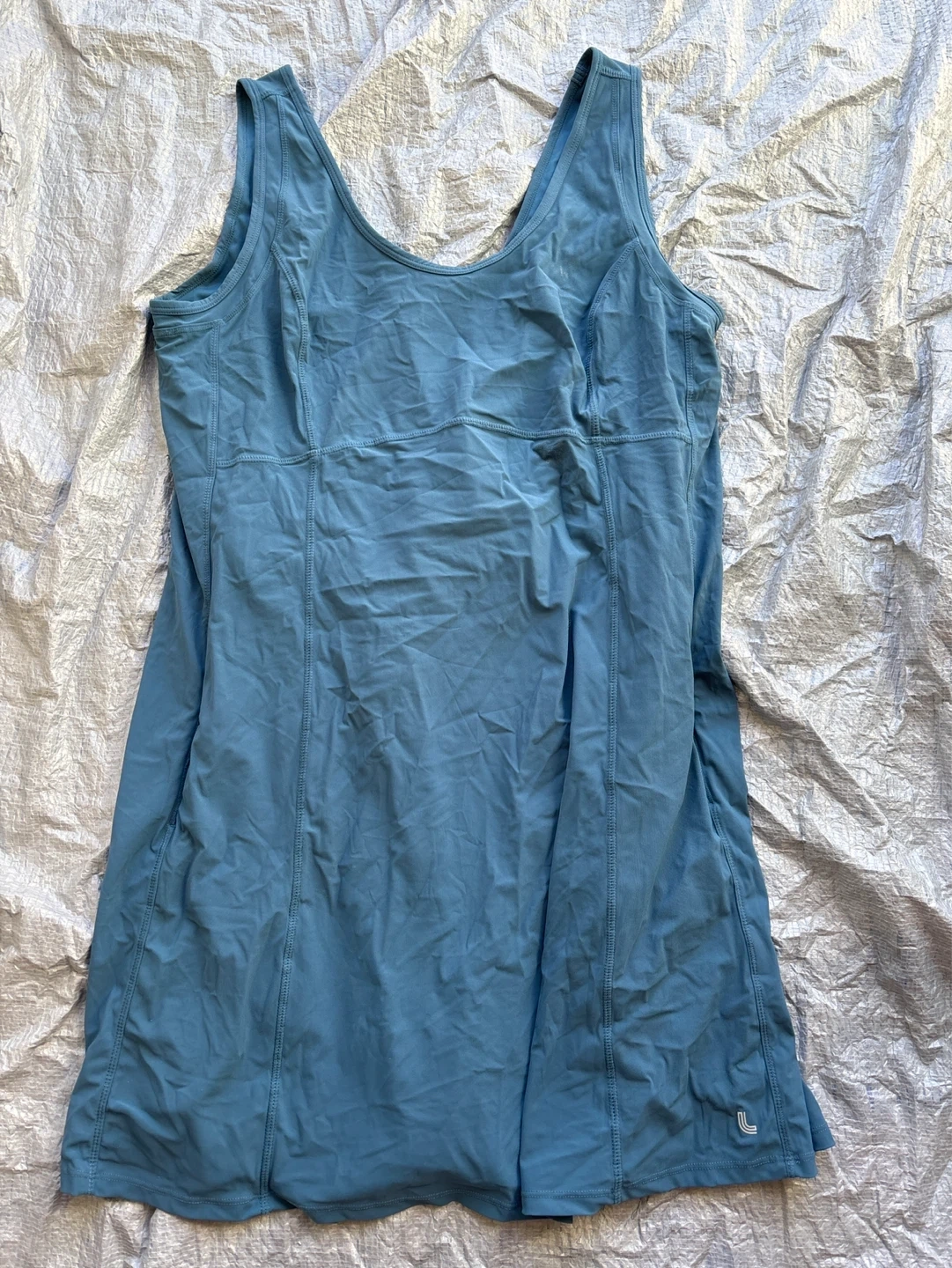 This Lolé tennis dress is a lovely blue colour. It's a size XL and comes with built-in shorts. Great for playing sports!