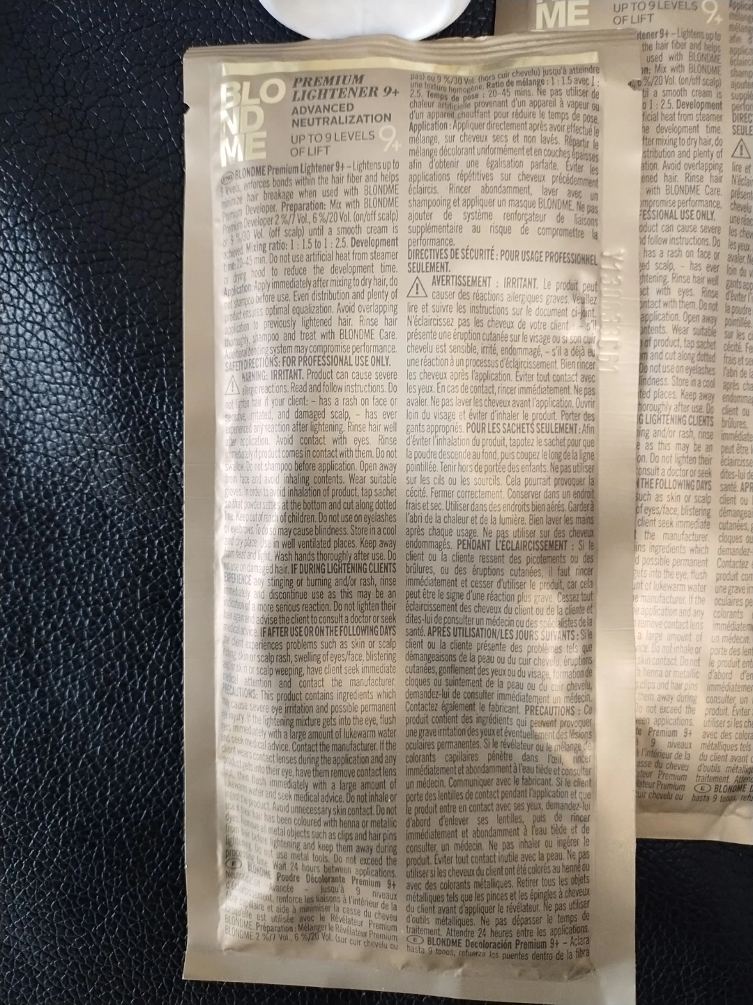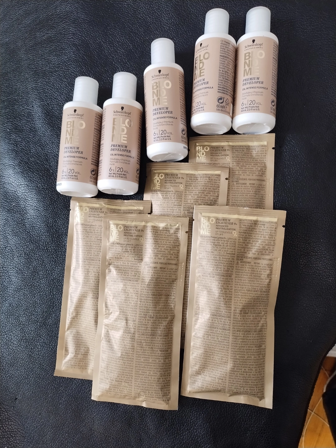 five bottles of Schwarzkopf Blonde Me Premium Developer, 6% volume, 60ml each. 5 sachets of Schwarzkopf Blonde Me Premium Lightener 9+, for up to 9 levels of lift.