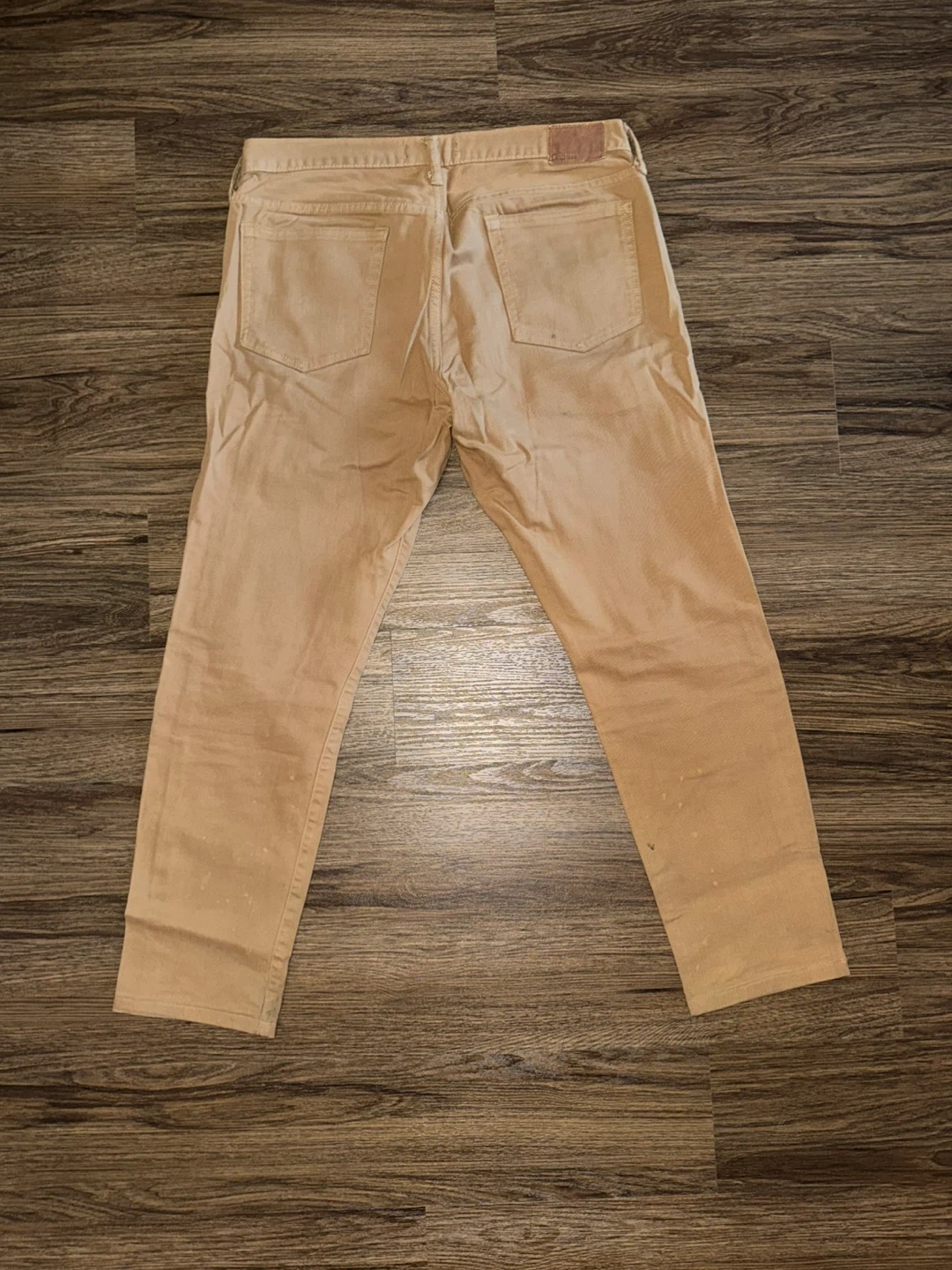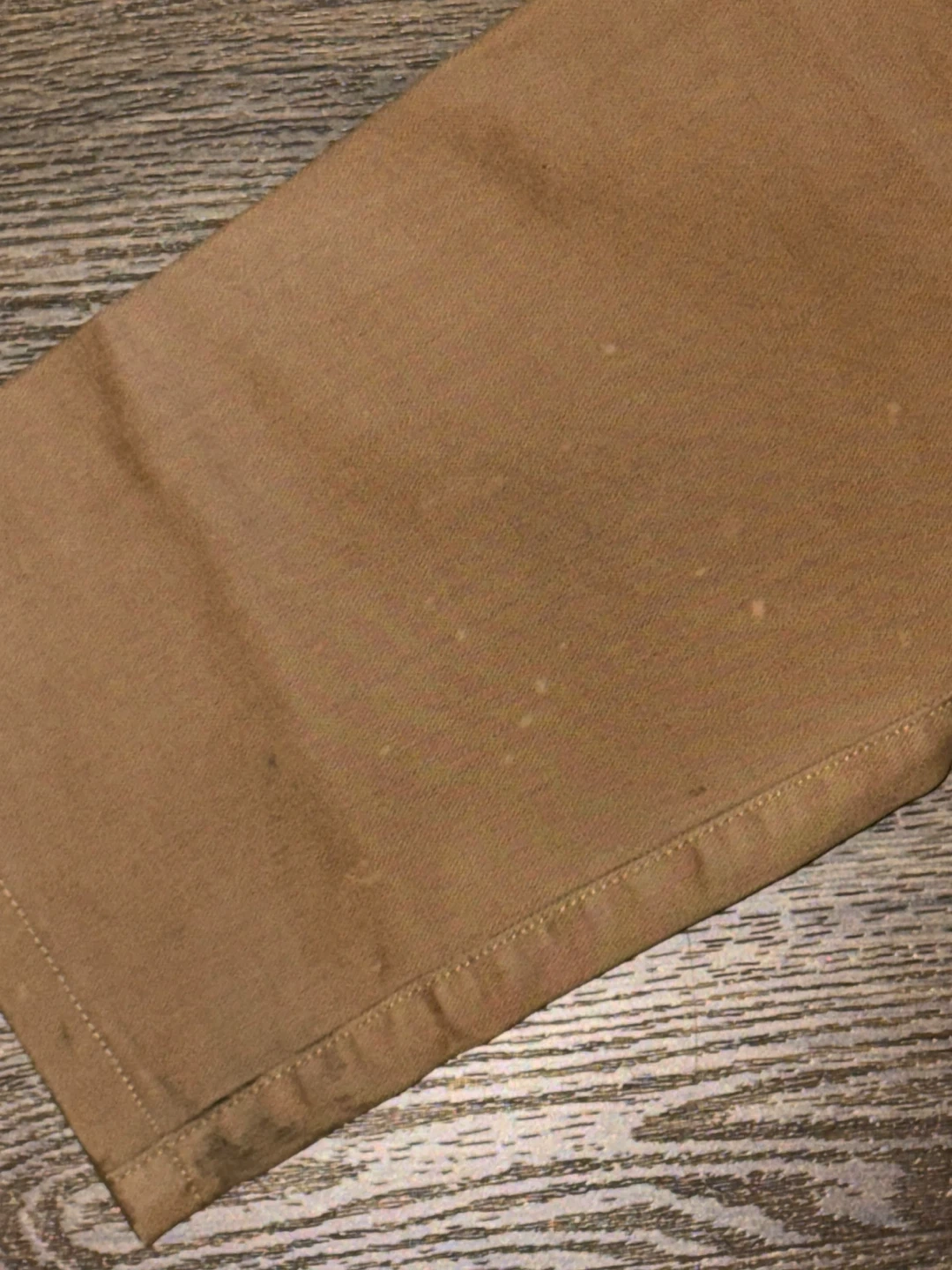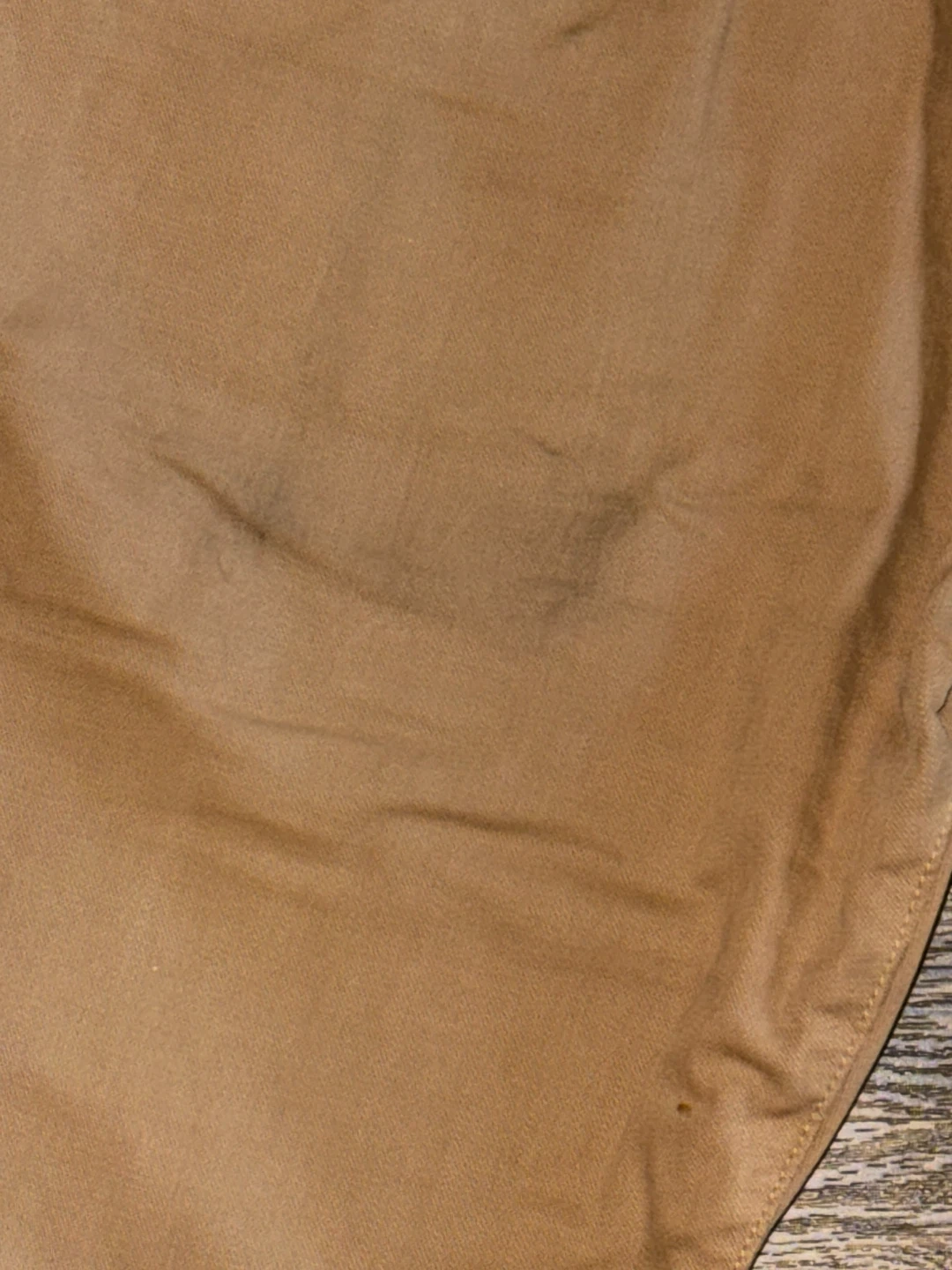 These tan chinos are a versatile addition to any wardrobe. They're made from a durable cotton blend. Some minor marks are present on the fabric.