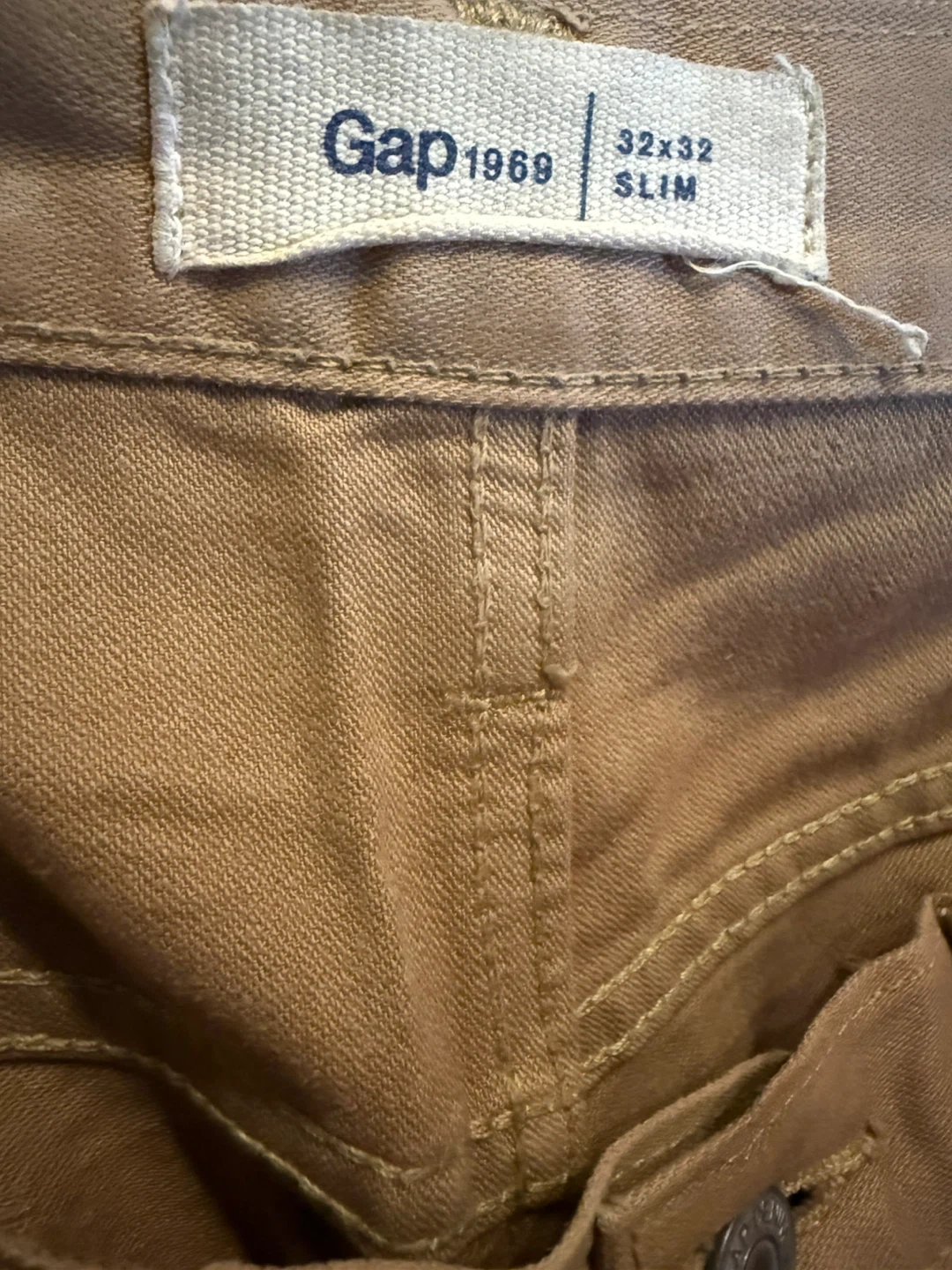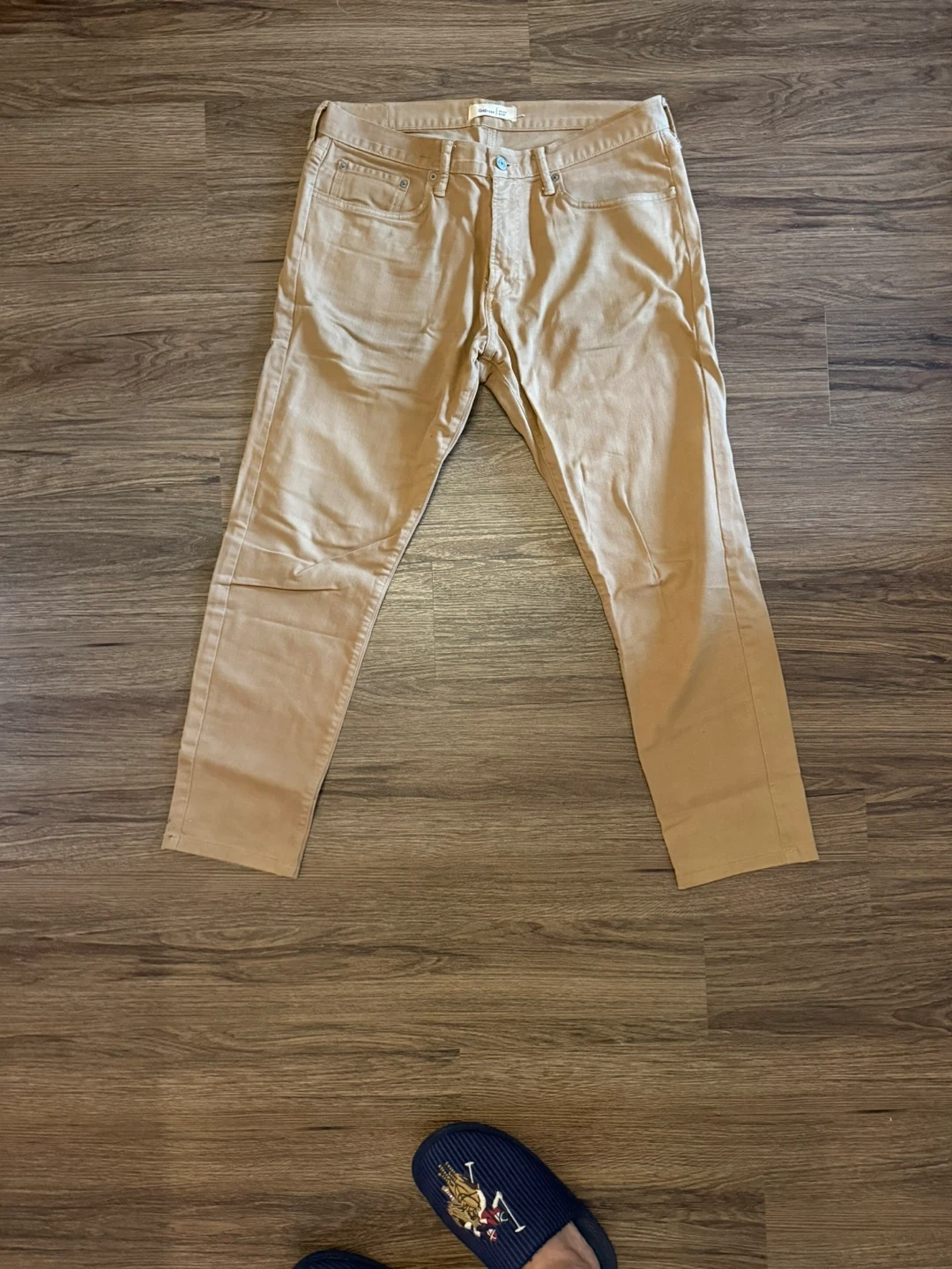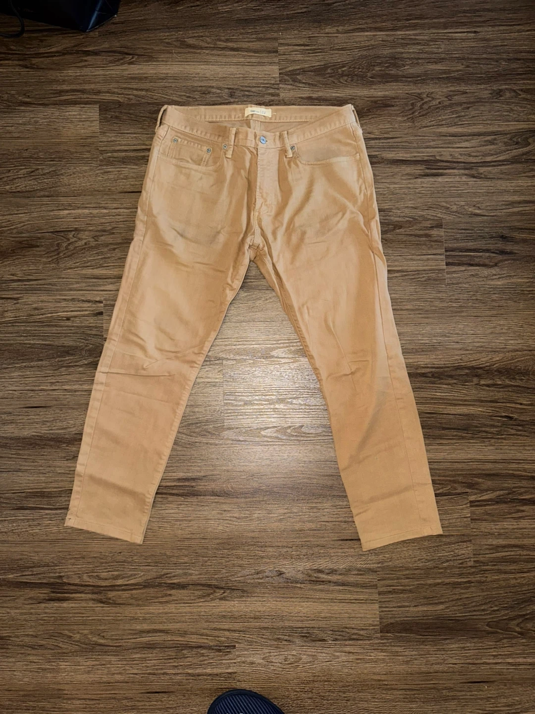 These tan chinos are a versatile addition to any wardrobe. They're made from a durable cotton blend. Some minor marks are present on the fabric.