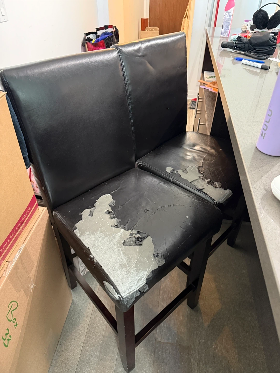 This black bar stool has a dark wood frame. The faux leather seat shows significant wear and tear, with peeling material. It's a counter-height stool. This could be useful for someone looking to reupholster or repair.